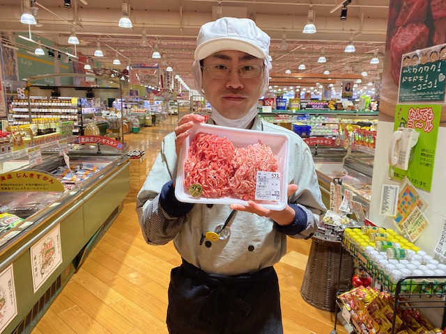 おはようございます、ミートコーナー本日のおすすめ商品は、道内産豚肉生挽肉のメガパックです! ハンバーグや、餃子、そぼろになど用途豊富で、使いたい分だけ使って、あとは冷凍保存にもおすすめな、大容量パックです! こちら100g当り88円の均一特価にて販売しておりますので、どうぞご利用下さいませ!!