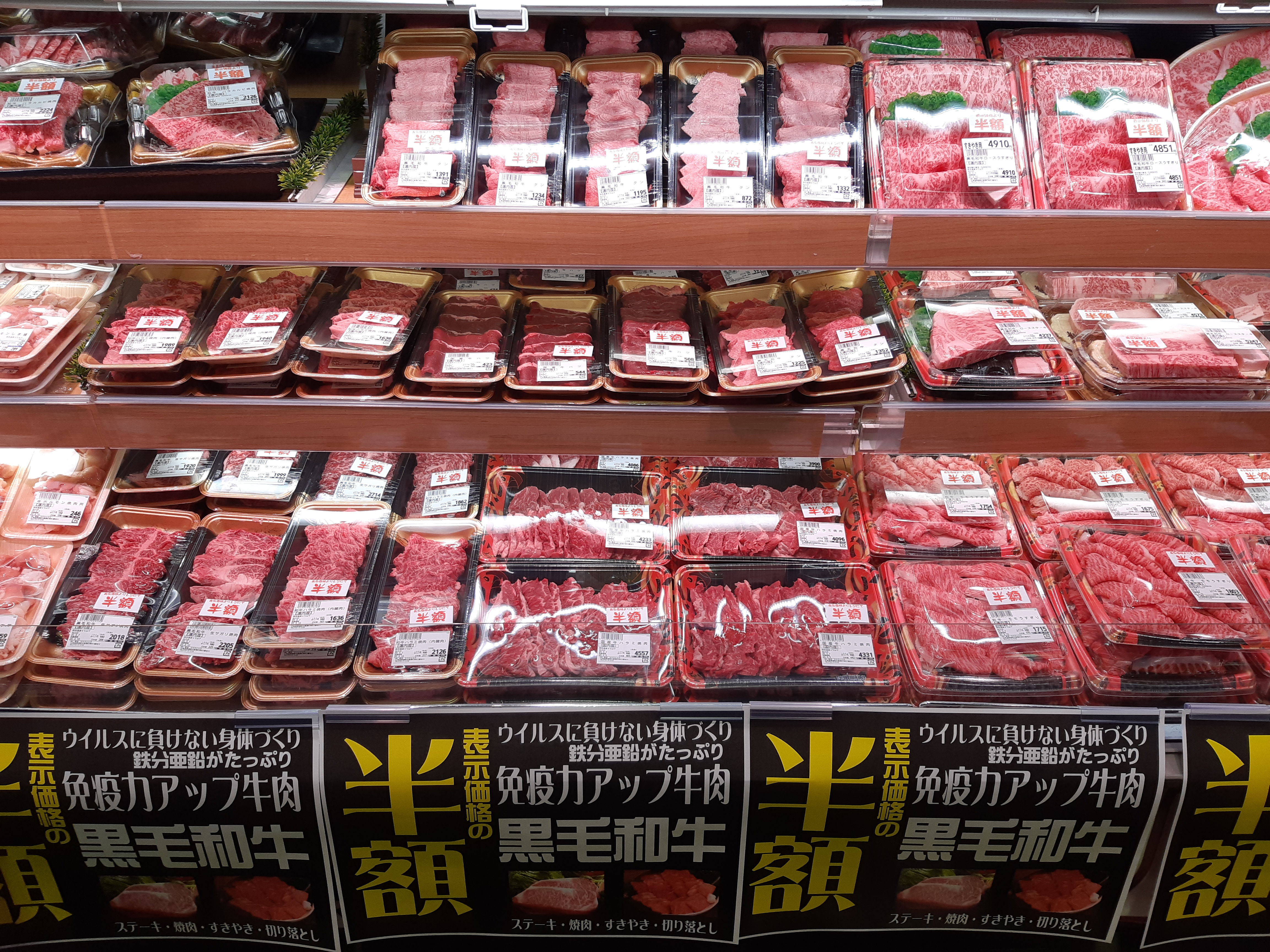 本日はミートコーナー焼肉がオススメ黒毛和牛の焼肉、ハラミ、サガリ和牛タン、カルビが表示価格の半額にて展開中、限定品ですのでお早めに、、その他にも、和牛のシマチョウセンマイ、ハチノス、ギアラなどの希少部位も販売中です