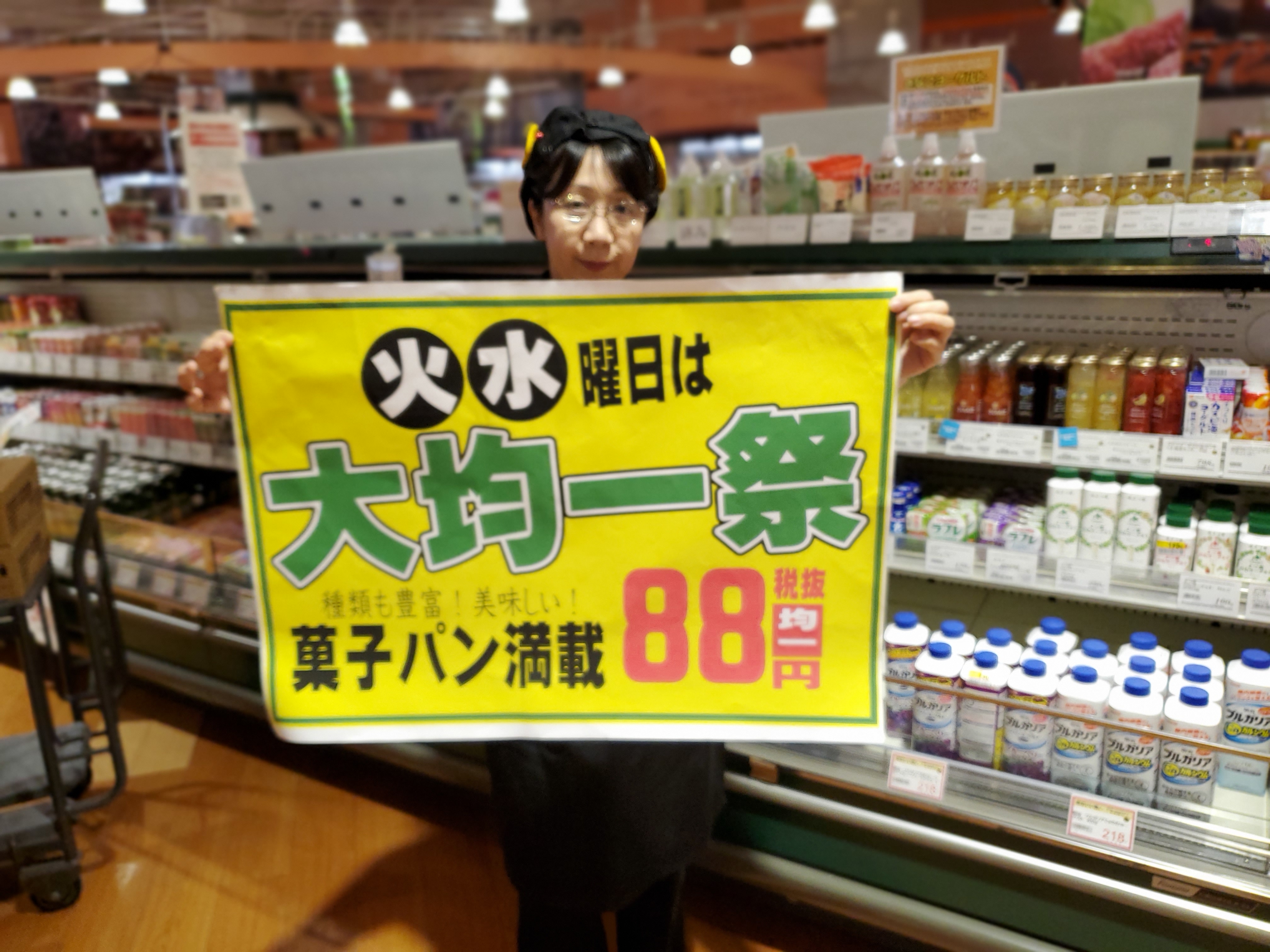 今日は毎週恒例の人気の均一祭です。菓子パンも88円と50種類以上品揃えしてますのでお子様のおやつにも喜ばれるとおもいます。お早めにご利用お待ちしております。(^-^)v