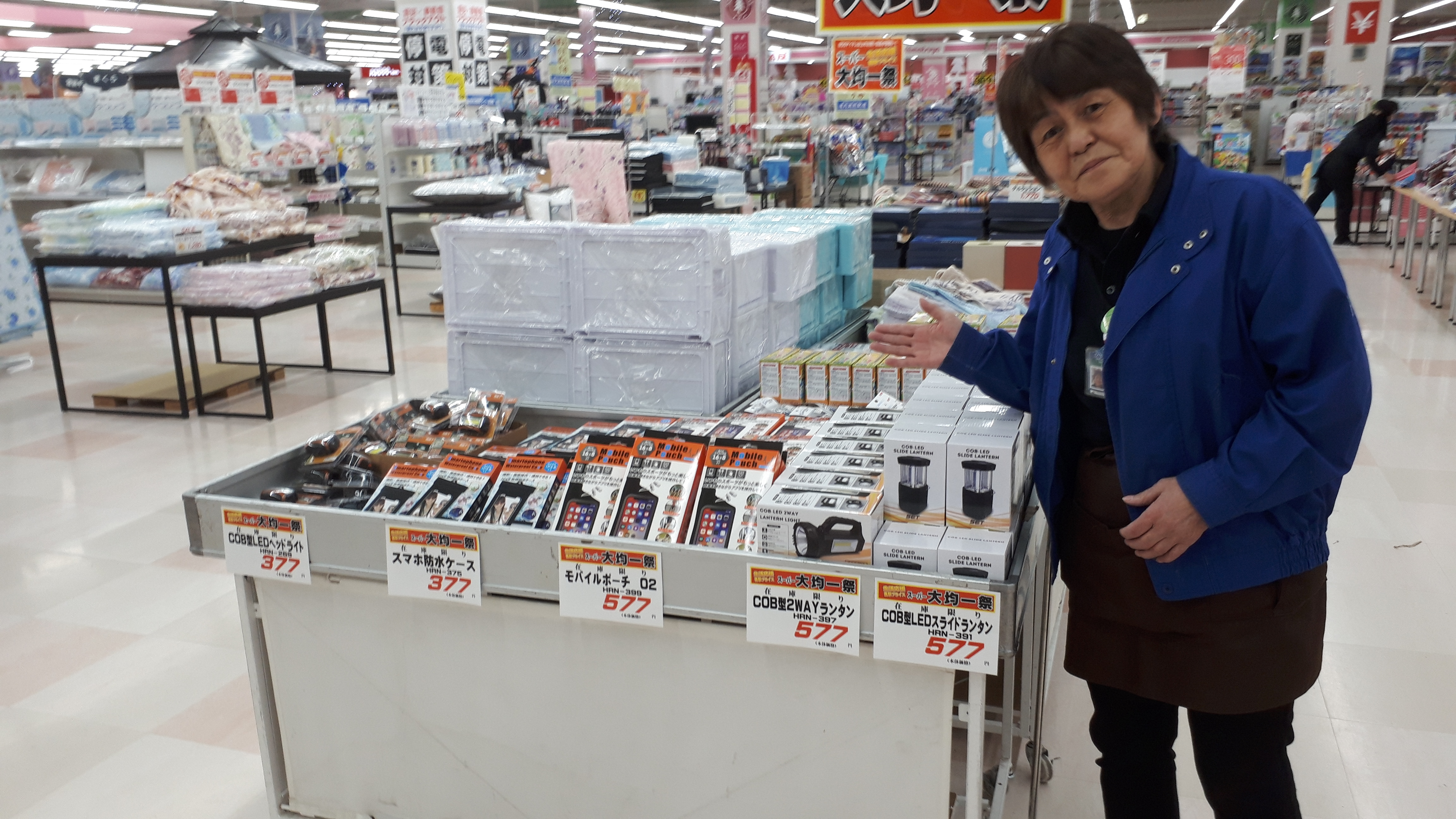 家電コーナーよりご案内いたします。本日当店では生活応援スーパー大均一祭開催!当コーナーではランタンライトやヘッドライト、小型のLEDライトなど防災としても使える商品を激安の均一特価でご奉仕いたします!ぜひこの機会に当店家電コーナーでお買い求めください!