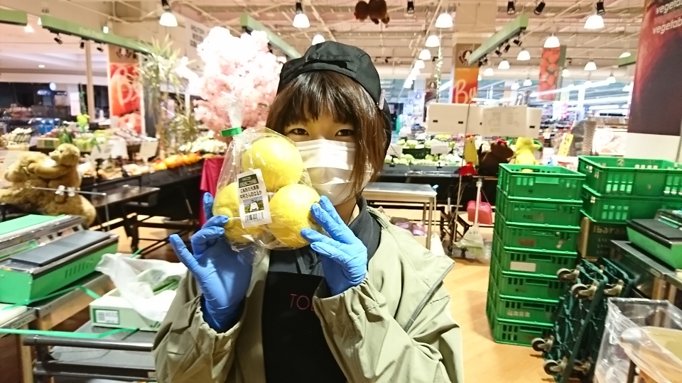 青果担当苫米地より、本日のオススメ商品です。今日ご紹介するのは広島産のはるかです。見た目はレモンのようですが、酸味は控えめで、まろやかな甘さと柔らかな果肉が詰まっています。酸っぱいのが苦手な方にオススメの柑橘ですので、ぜひご利用ください。