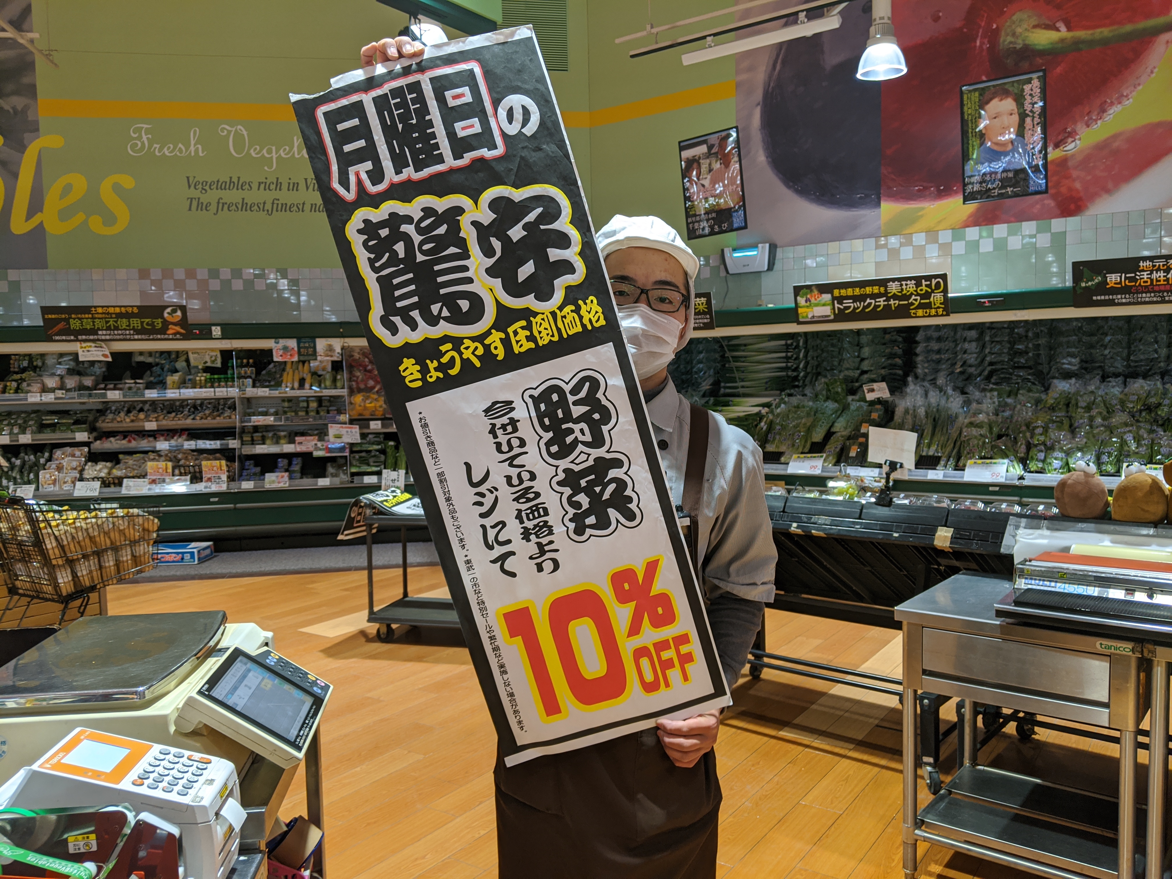 本日はお野菜全品レジにて1割引の日ですよ!徳用野菜から当店にしかないこだわりの野菜まで全て1割引でご購入できます!是非ご利用くださいませ