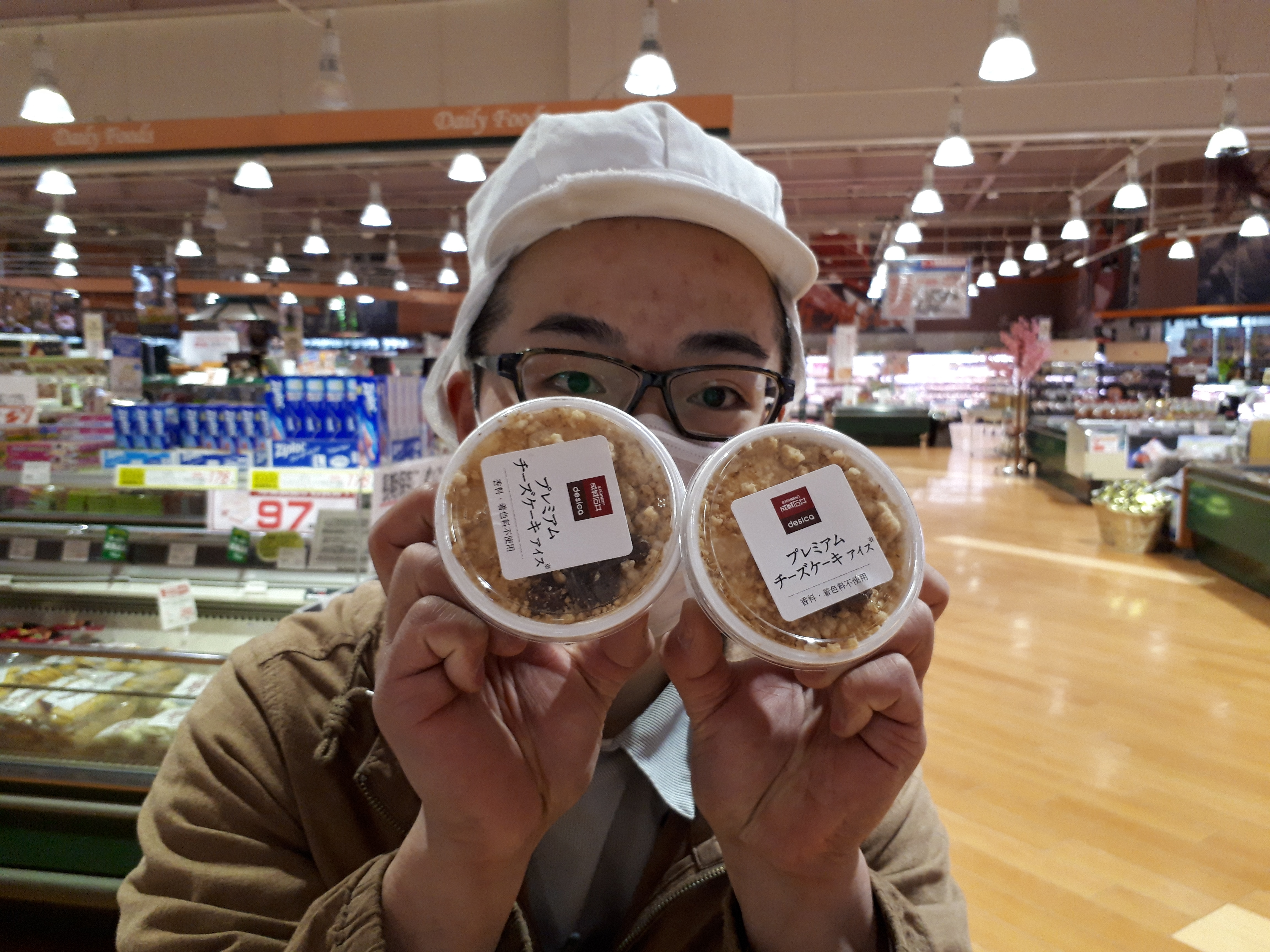おはようございます。日配コーナーのおすすめは、成城石井のチーズケーキアイス。クリームチーズを使用した濃厚アイスクリームにレーズンとほろほろしたシュトロイゼル風クッキーをトッピングしています。香料や着色料を使わない美味しいアイスクリームです。