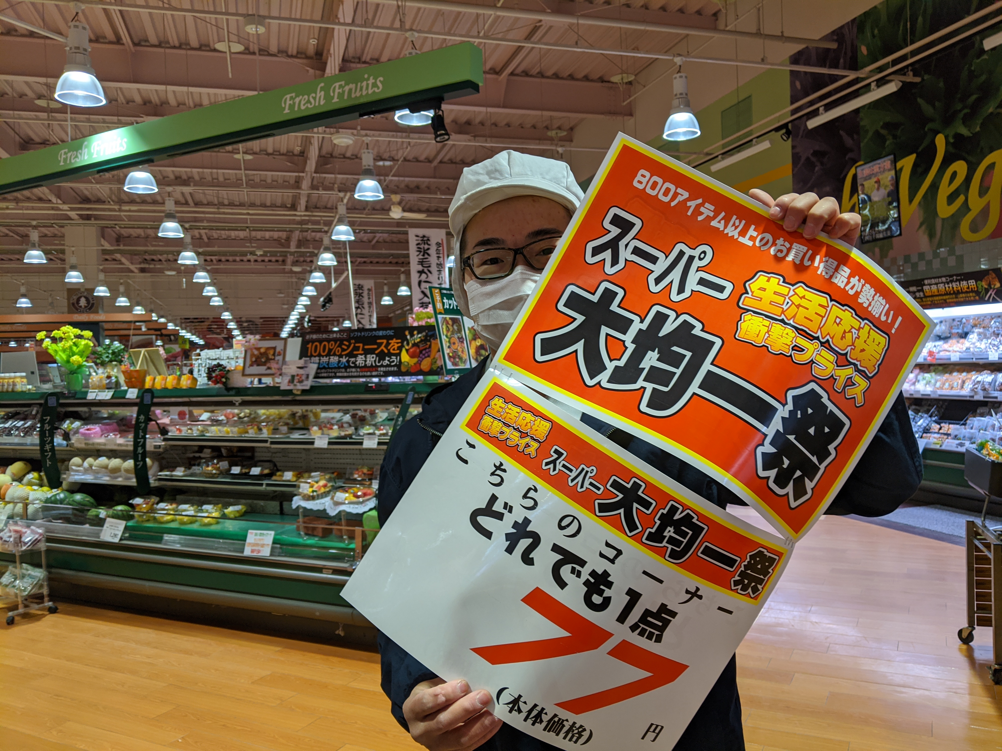 本日もスーパー均一祭開催中ですよ!青果コーナーでは77円均一がオススメです!是非このお安い機会にご利用くださいませ!