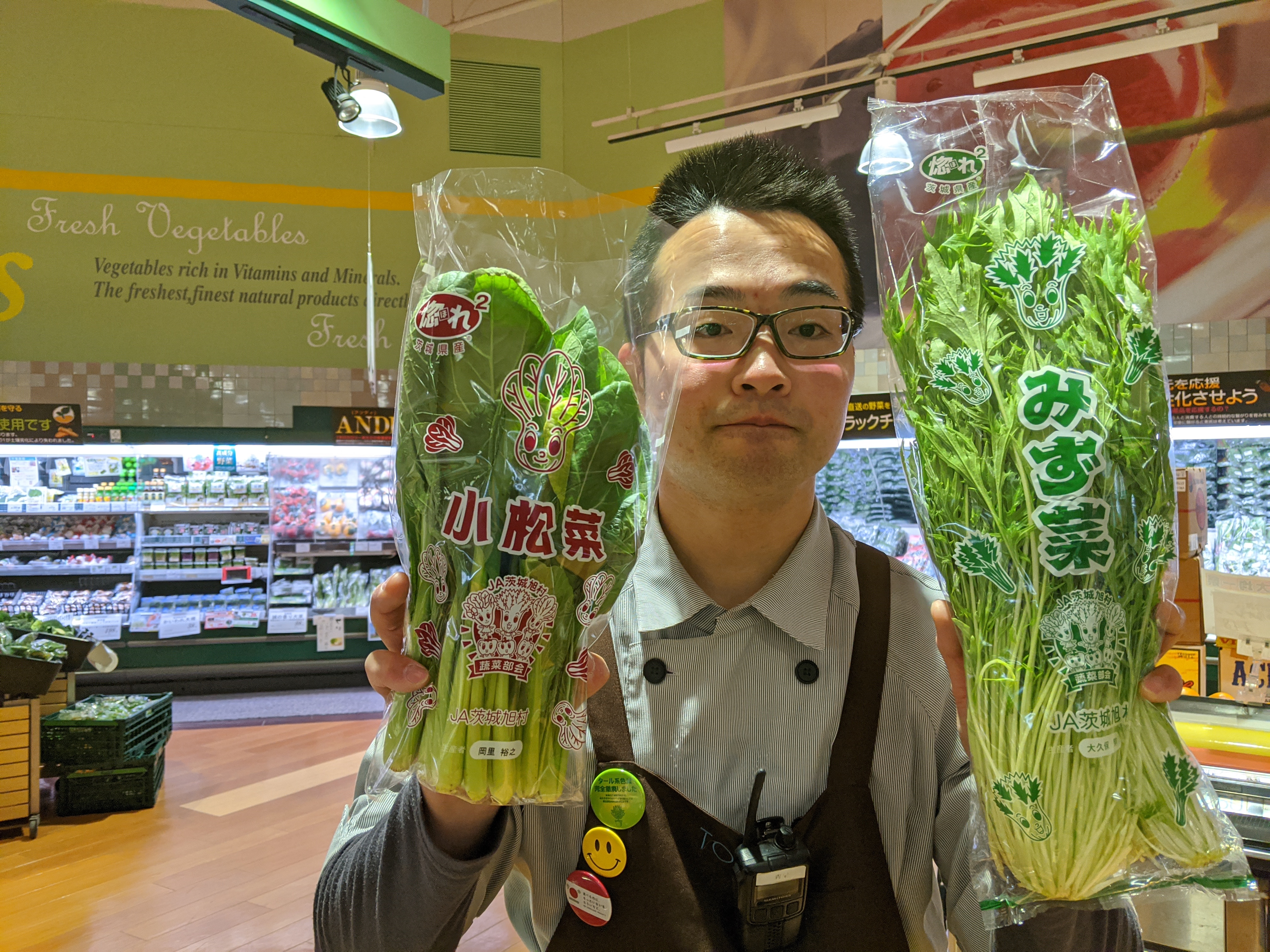 本日もスーパー均一祭を開催中です!青果コーナーではこちらの小松菜、水菜が77円とお買い得ですよ!是非このお安い機会にご利用くださいませ、お待ちしています!