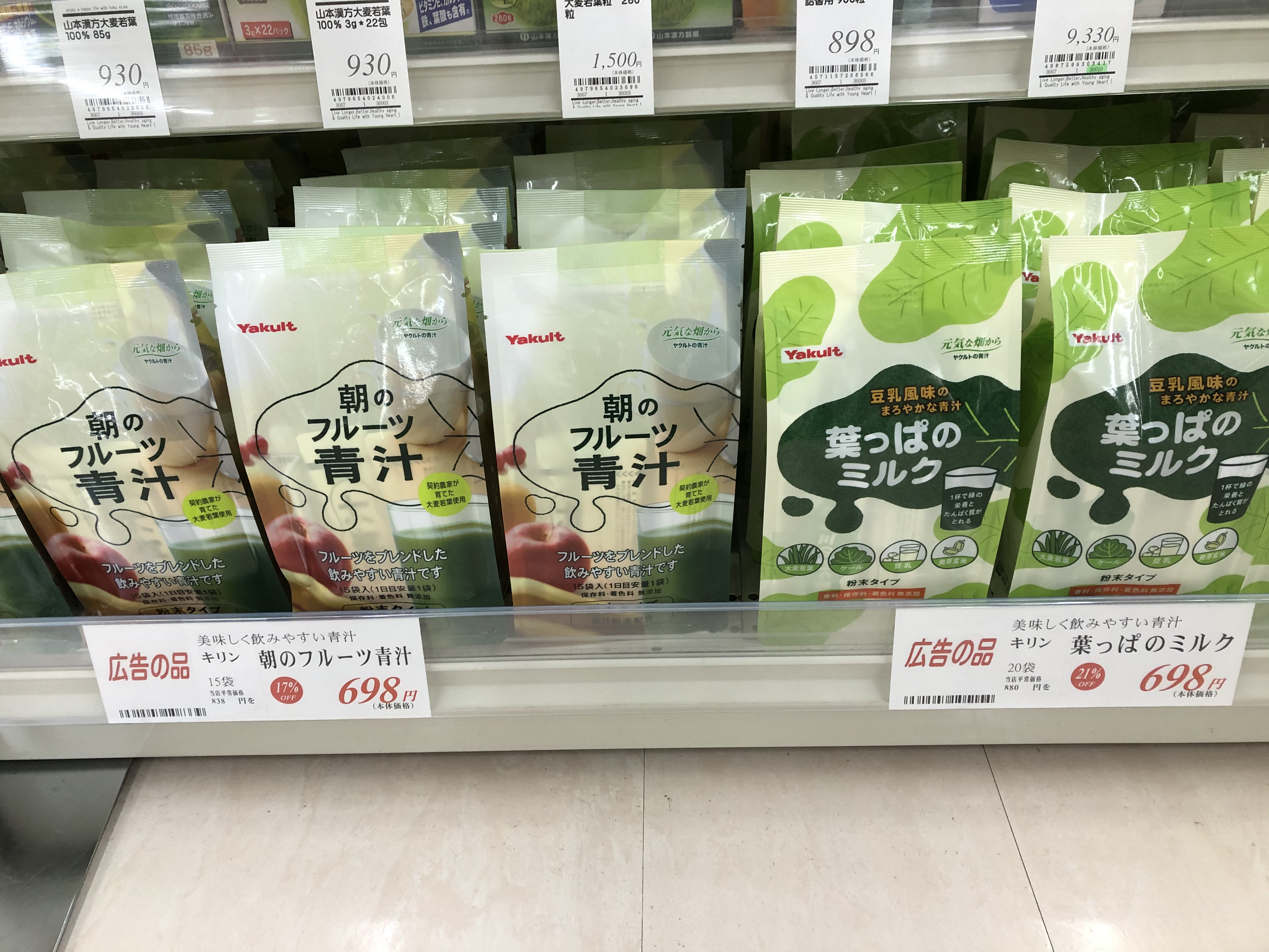 みなさんこんにちは!本日ドラッグコーナーのお買い得品は「朝のフルーツ青汁」「葉っぱのミルク」です!フルーツをブレンドした飲みやすいタイプ、豆乳風味のまろやかな青汁で大変飲み易く野菜不足が」気になる方におすすめ商品です!お得なこの機会是非ご利用くださいね!