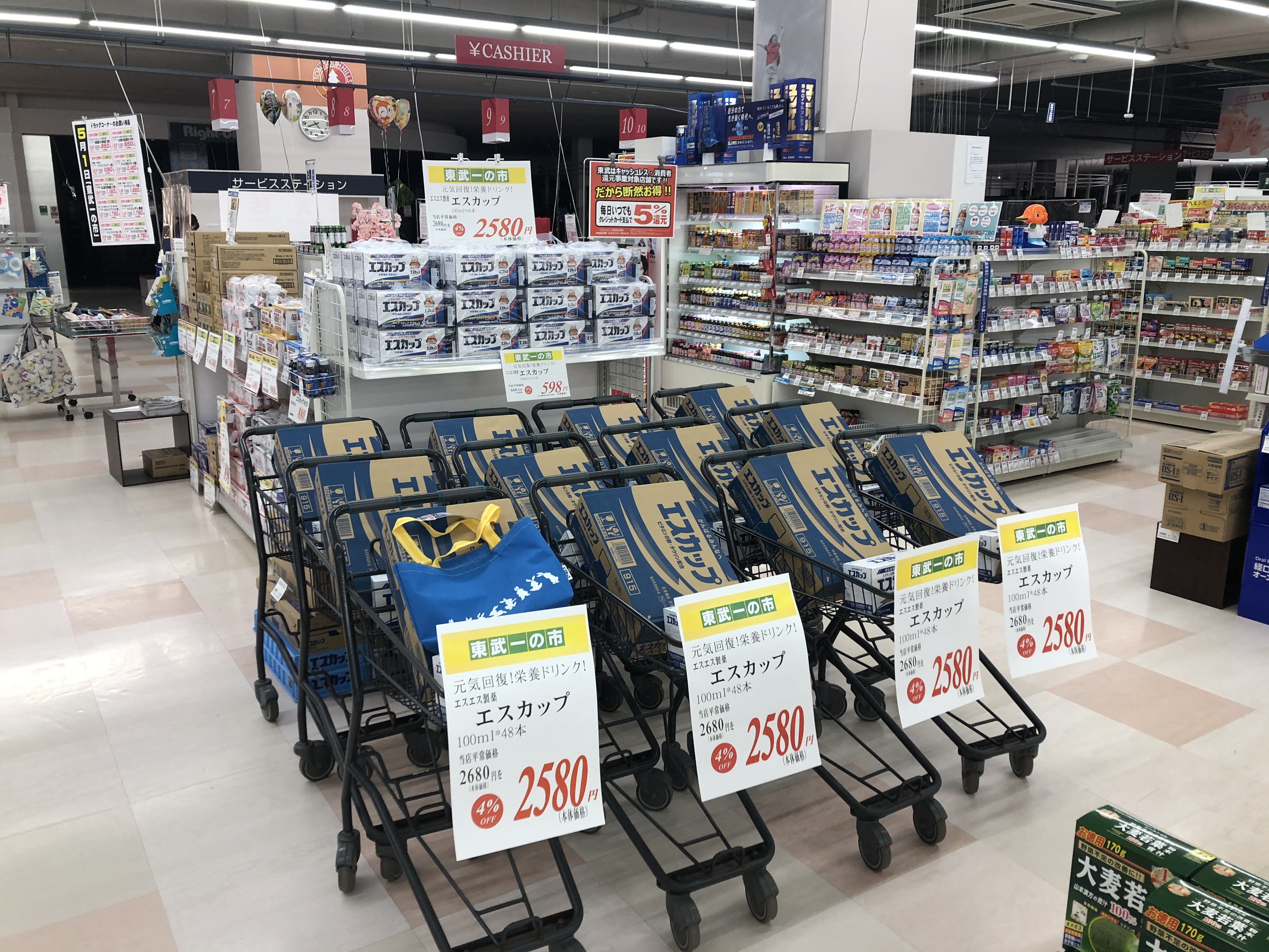 みなさんこんにちは!今日は月に一度のお買い得な日,東武一の市です!ドラックコーナー本日はエスカップがお買い得です!お買い得なこの機会是非ご利用くださいね!