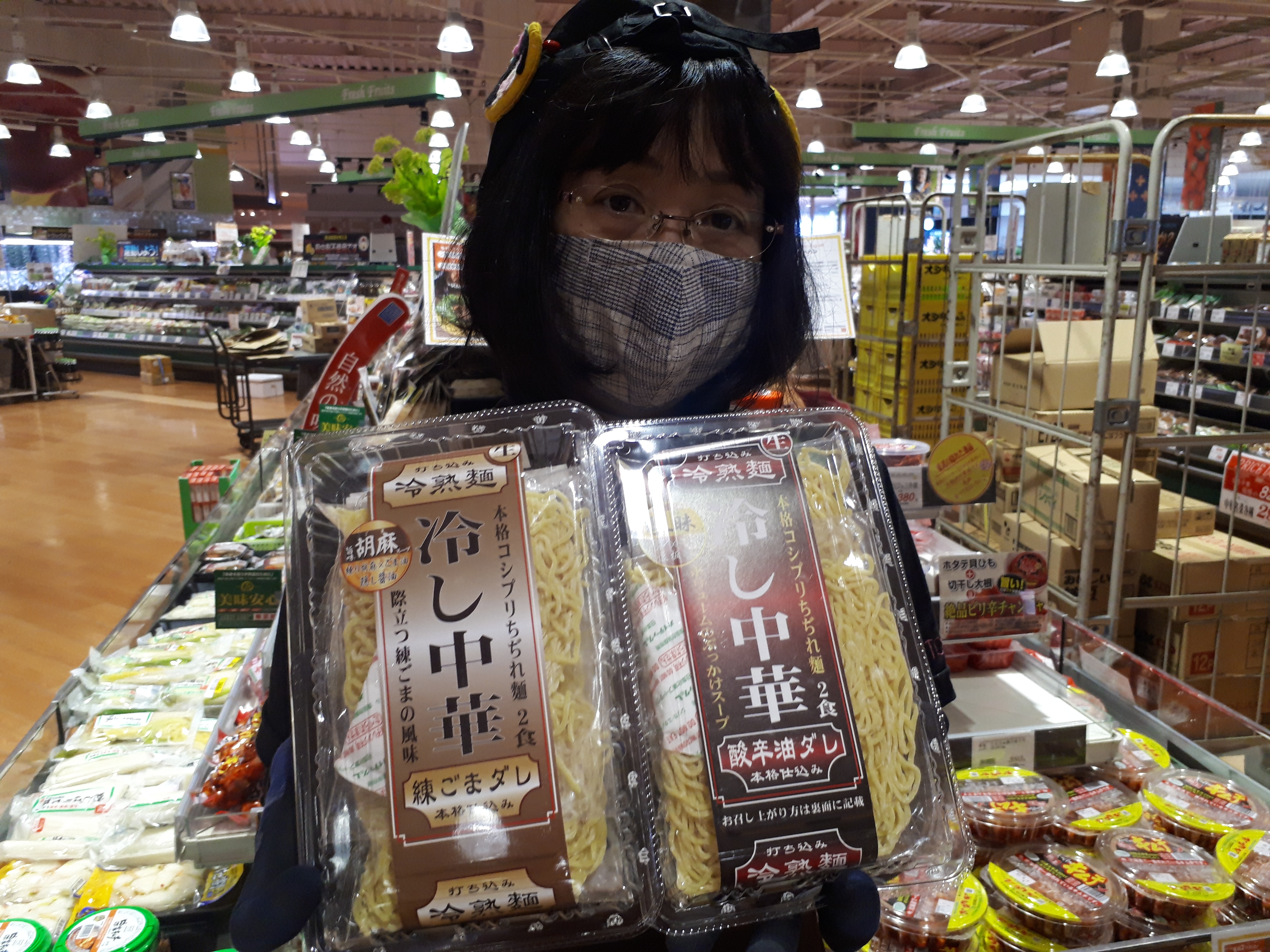 おはようございます。日配コーナーのおすすめは、出雲たかはしの冷やし中華。コシプリの本格ちぢれ麺にレモン果汁と豆板醤を効かせた酸辛油だれと、練りごまだれの2種類を販売しています。ぜひ、食べてみてください!