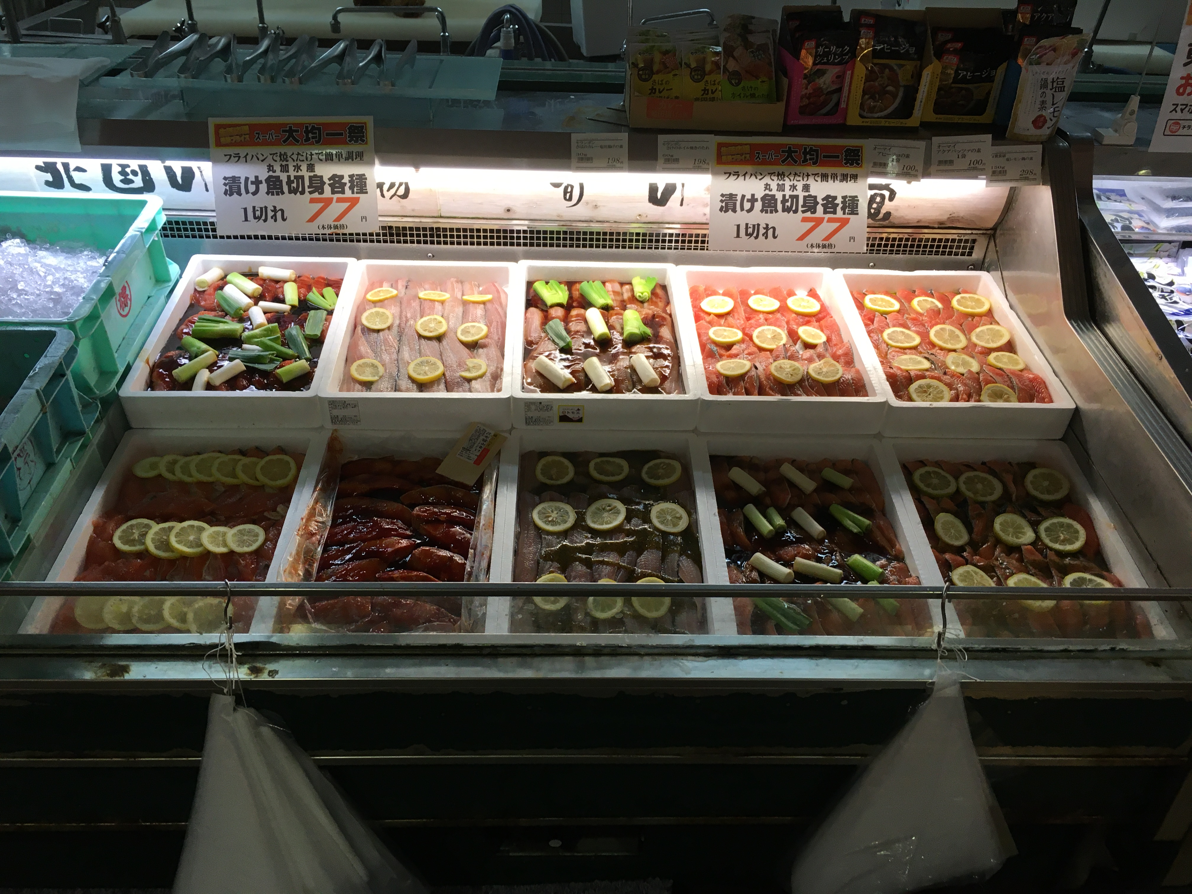 おはようございます。今日は、手作り漬魚がお買い得!旬の時鮭、サクラマス、ホッケを独自の味付けでご紹介!レモン塩やバジル、テリ焼きと種類を豊富に揃えております。1切77円ですのでぜひ、ご利用下さい。