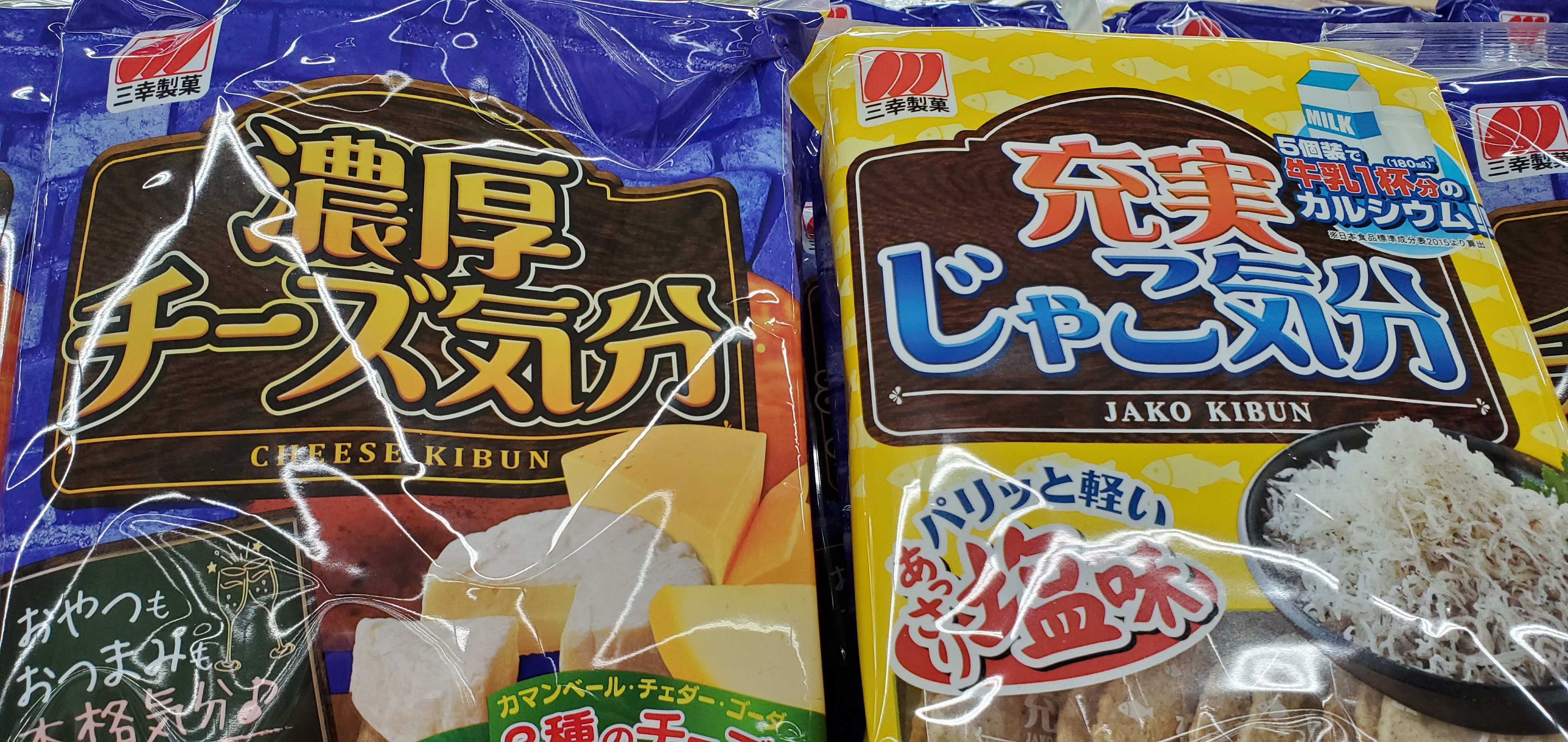 三幸製菓から新しく濃厚チーズ気分、充実じゃこ気分の2品が発売しました。パリパリせんべいに三種類の濃厚チーズ味とカルシウム、ミネラルたっぷりのじゃこ味はどちらも美味しいです。今、お買い得なのでぜひ、ご利用お待ちしております。