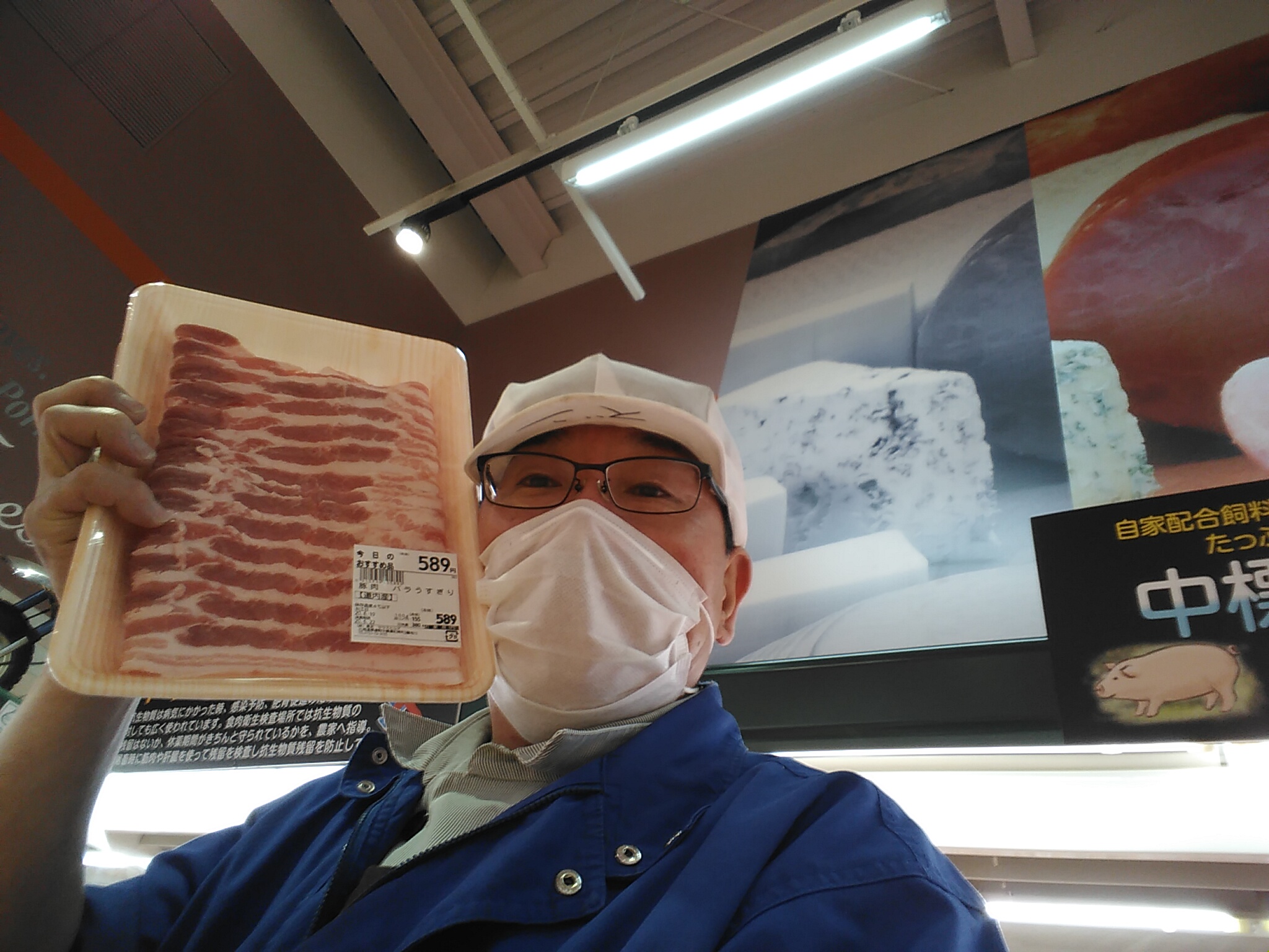 おはようございます!本日ミートコーナーからは、豚バラスライスのご案内です!今日は、競合店対抗商品で100g当たり125円で販売です!焼き肉、野菜炒め、シチュー、カレーにおつかえ頂ける商品でとてもお買い得で販売ですので是非ご利用下さい!