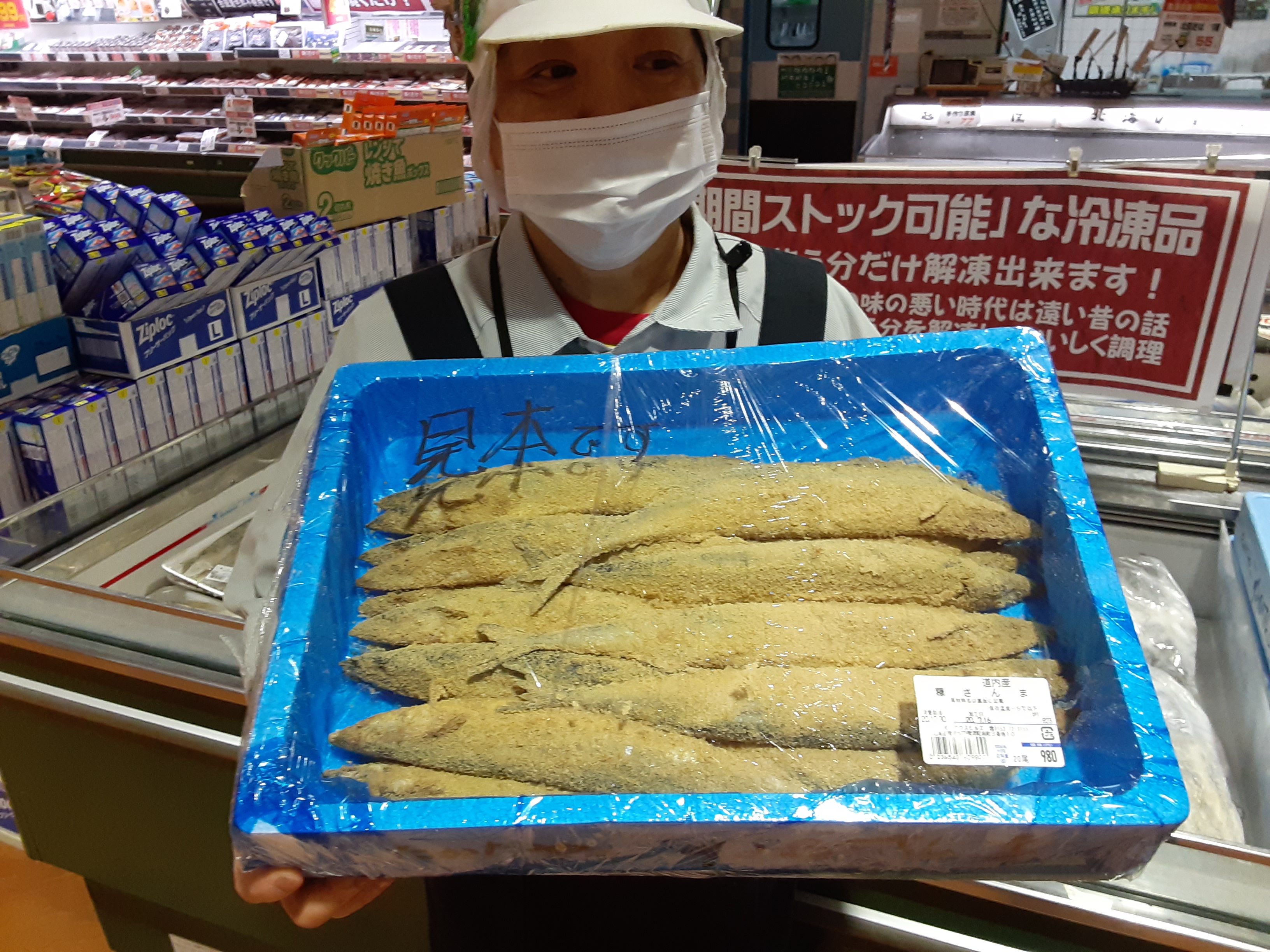 おはようございます。本日は大人気の道内産の糠さんま20匹入りで980円とお買い得!脂の乗りも最高です。ご飯のおかず、お酒のおつまみに最高の1品です。是非とも鮮魚コーナーでお待ちしています。