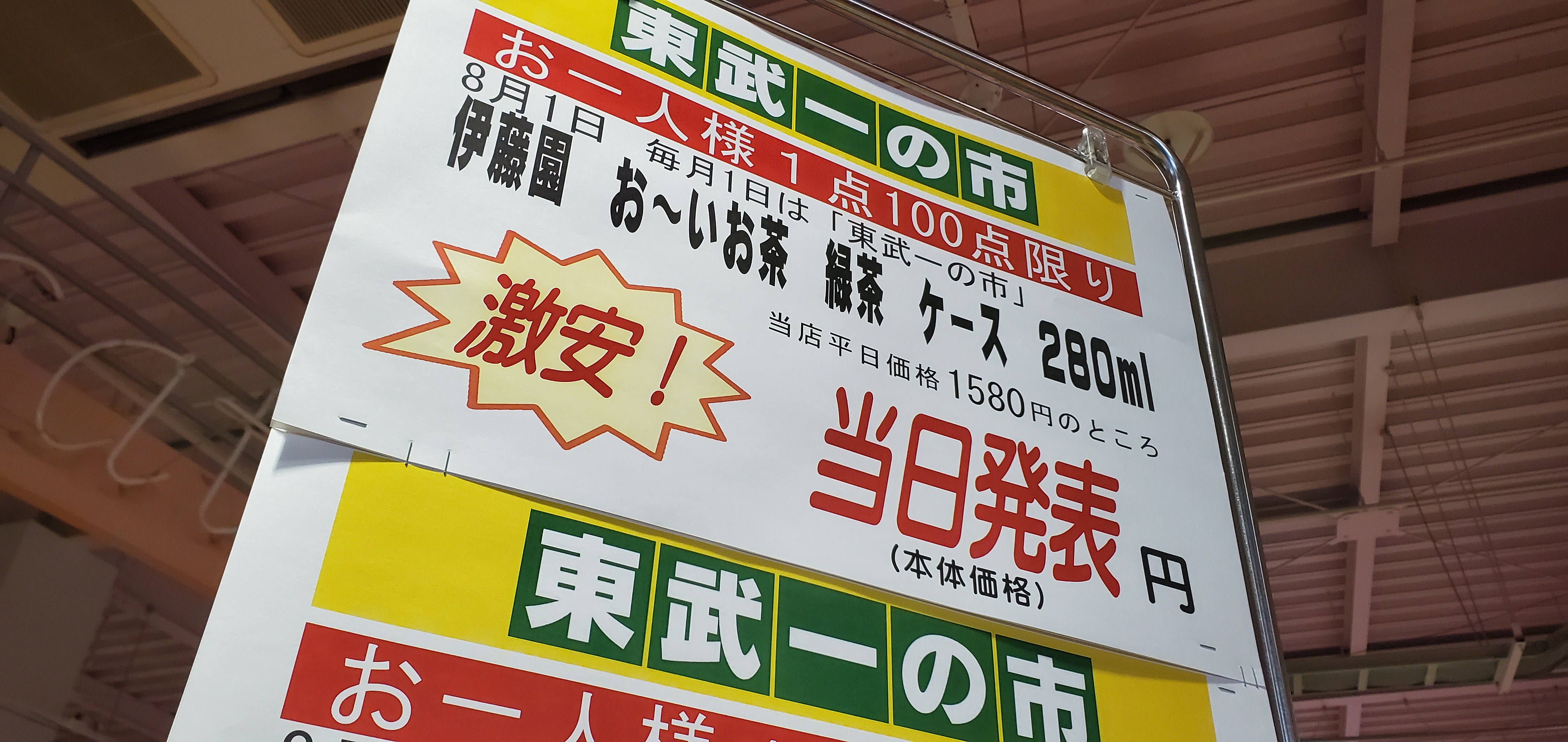 8月もすぐそこ!8月1日と2日は東武の一の市を開催!チラシは出しませんが東武にきたらお買い得な目玉商品がたくさんあります。大好評のお~いお茶も販売しますよ!ご期待の上、ご来店お待ちしております。(^o^)/