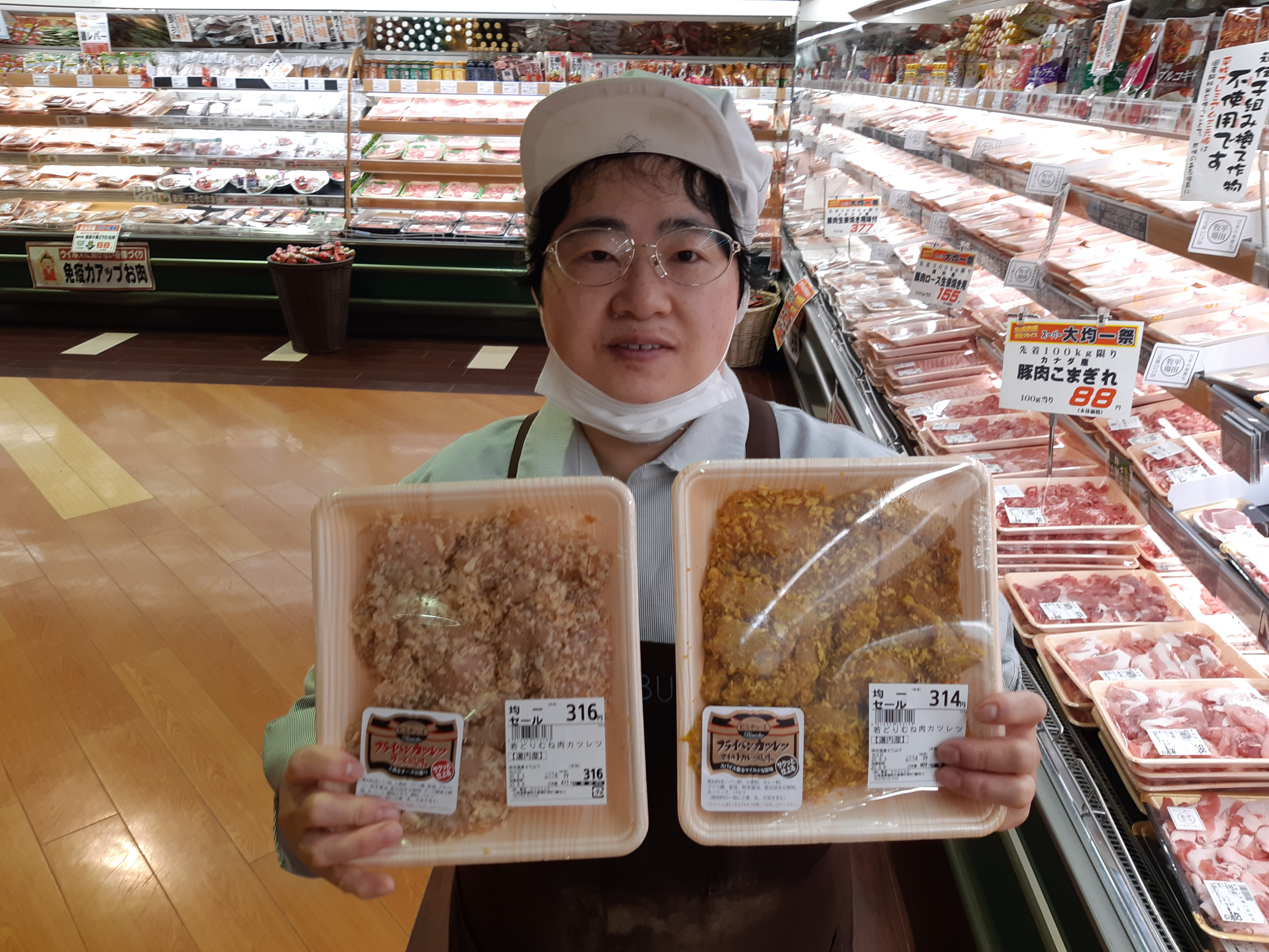 本日ミートコーナー、担当、向山のオススメは、若鶏カツレツがイチオシですフライパンで焼くだけ簡単調理カレー味、マヨネーズ味、チーズ風味均一特価の100g当たり77円で販売中