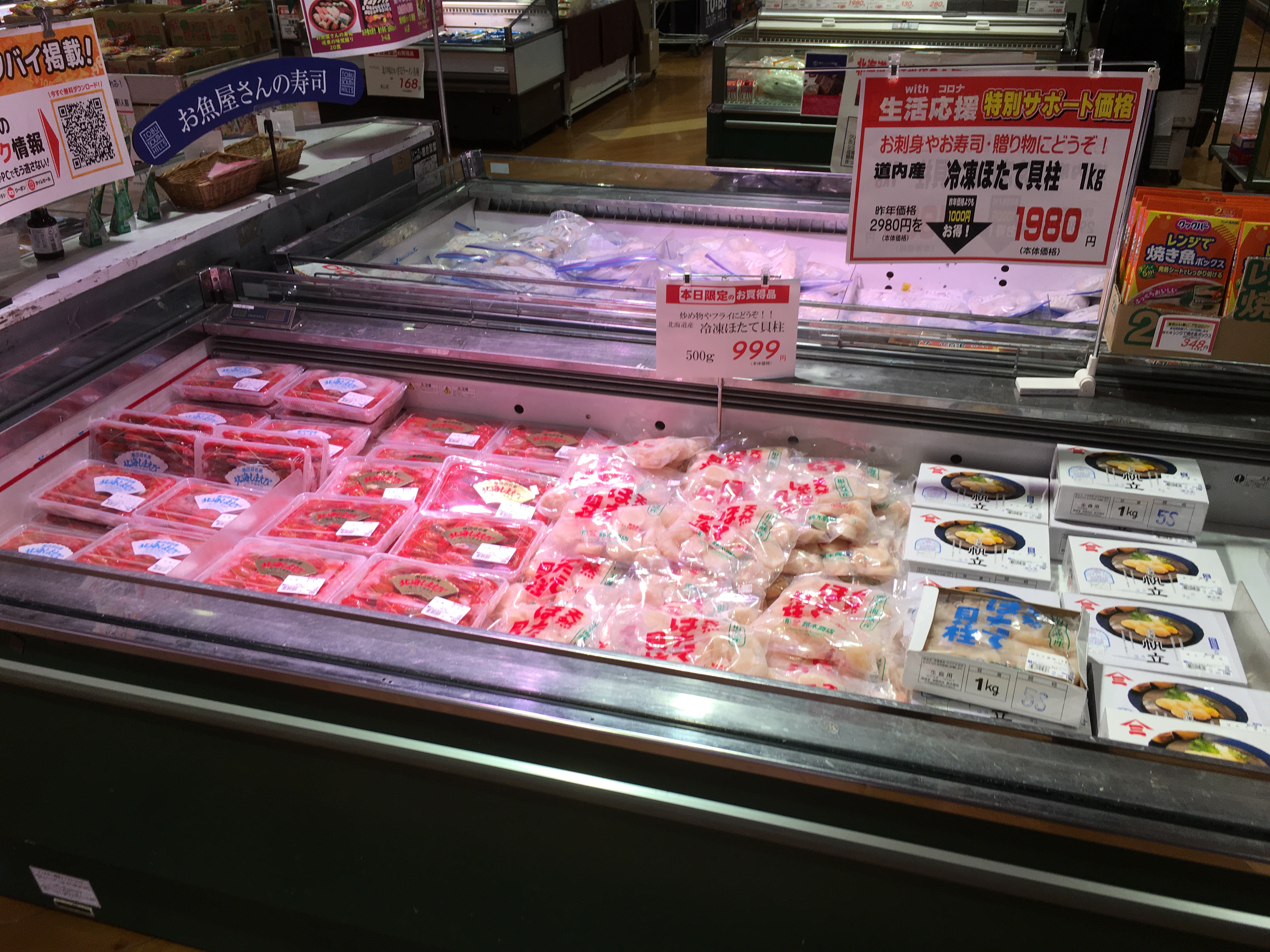 おはようございます。今日は贈り物やお土産に最適な北海しまえび、冷凍帆立がお買い得!夏の風物詩!尾岱沼のしまえびは味や食感が最適です。近海のほたては身が甘く刺身や炒め物にどうぞ!
