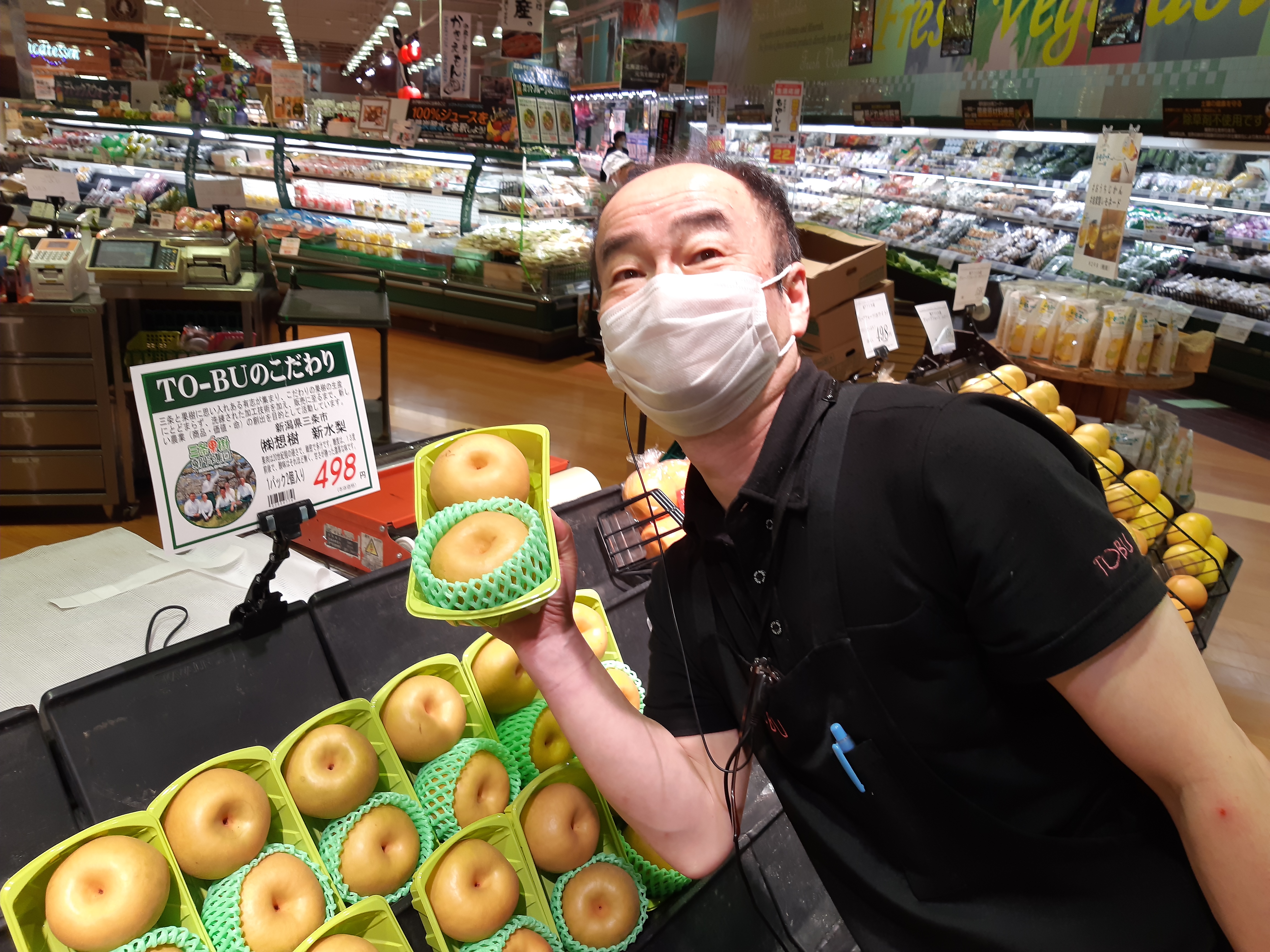 本日青果コーナー担当柴田のイチオシは三条果樹園の新水梨がオススメ果肉の硬さで多汁、糖度は13度酸味はそれほど無く、甘さが勝った濃厚な味です、1パック2個入り498円で販売中