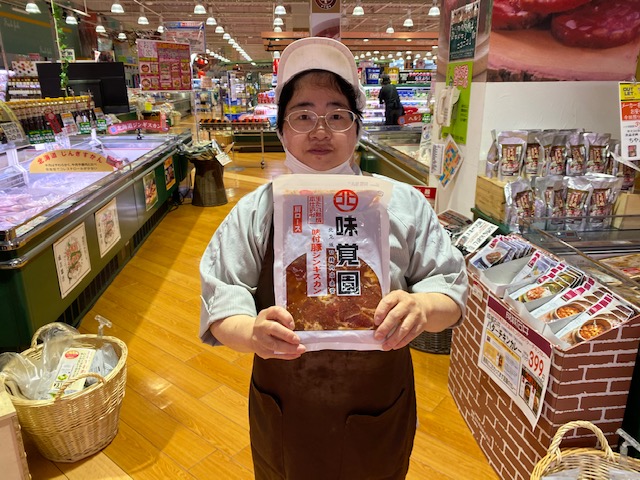 おはようございます、ミートコーナー本日のおすすめ商品は、味覚園豚ジンギスカンです!! 豚肉の肩ロースを使用、こだわりの生たれで味付けし、素材の持っている美味しさを最大限に引き出した豚ジンギスカンです! こちら、500g入って500円にて販売しておりますのでどうぞご利用くださいませ!!