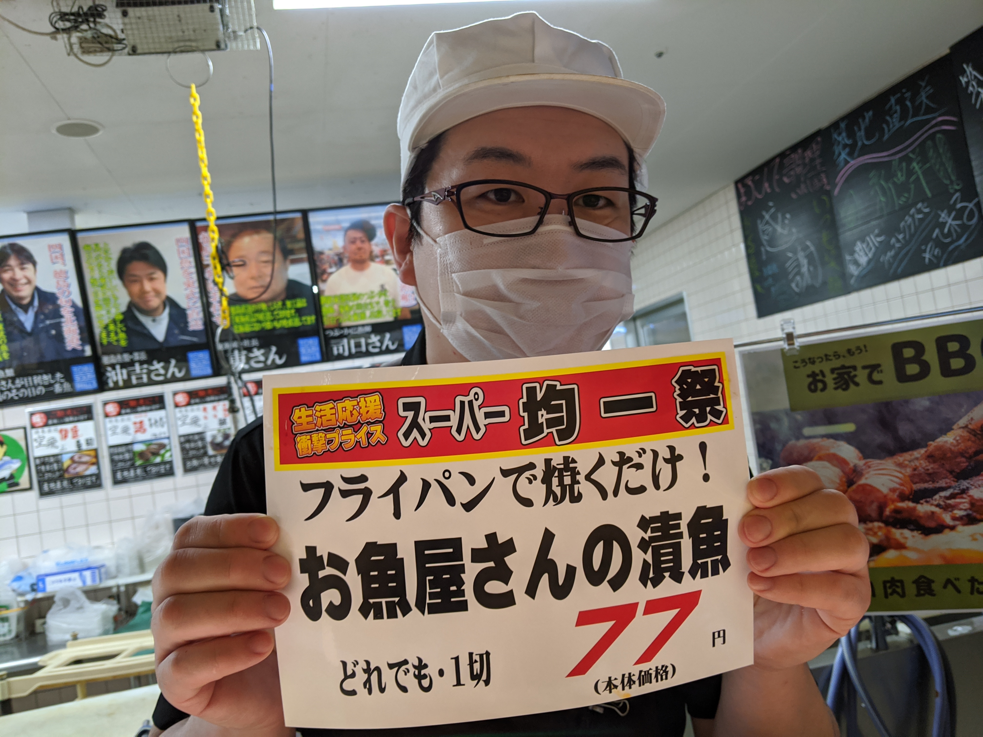 本日も均一祭を開催中ですよ!漬け魚がひと切れ77円と大変お買い得になっています!是非ご利用くださいませ!