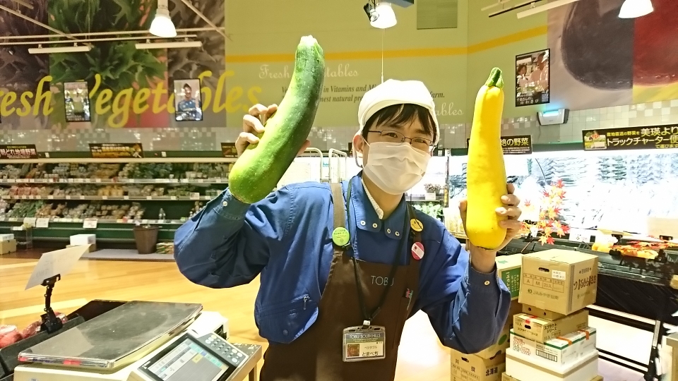 青果担当苫米地より、本日のオススメ商品です。今日ご紹介するのは弟子屈産のズッキーニです。今回は特大サイズのズッキーニが99円とお買い得!バーベキューにオススメの逸品です。ぜひご利用ください。