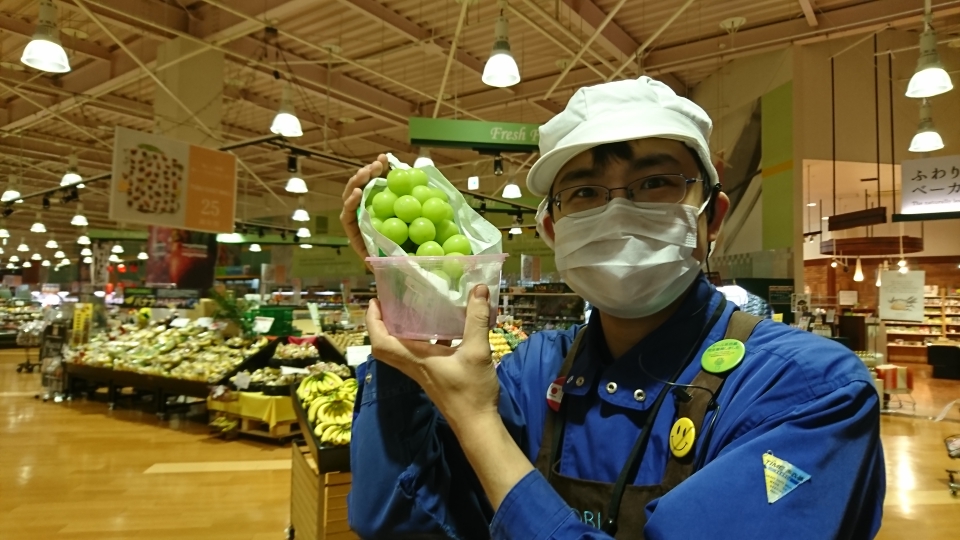 青果担当苫米地でより、本日のオススメ商品です。今日ご紹介するのは山梨県一宮から直送、古屋農園のシャインマスカットです。粒が大きく、大房で綺麗に輝く宝石のようなぶどうです。パリッとした食感で種が無く食べやすい人気の高級ぶどうをぜひご利用ください。