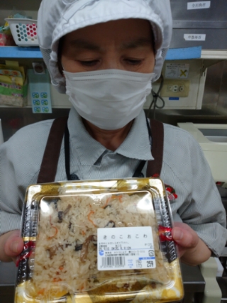 おはようございます。お惣菜コーナーではおこわを販売中。ふっくら美味しい秋にぴったりな逸品。きのこおこわ、山菜おこわをご用意してます。100g150円で販売中。是非ご利用ください。