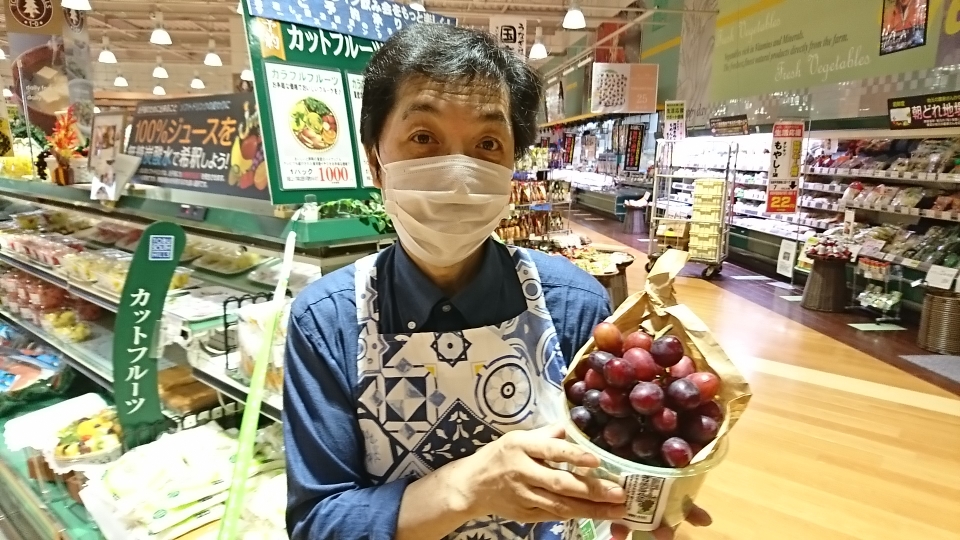 青果担当苫米地より、本日のオススメ商品です。今日ご紹介するのは山梨県一宮から直送、古屋農園のオリエンタルスターです。大粒で大房なこの赤ぶどうはしっかりとした歯触りでジューシー、甘くて酸味は控えめな美味しいぶどうです。贈り物にも喜ばれる美味しいぶどうをぜひご利用ください。