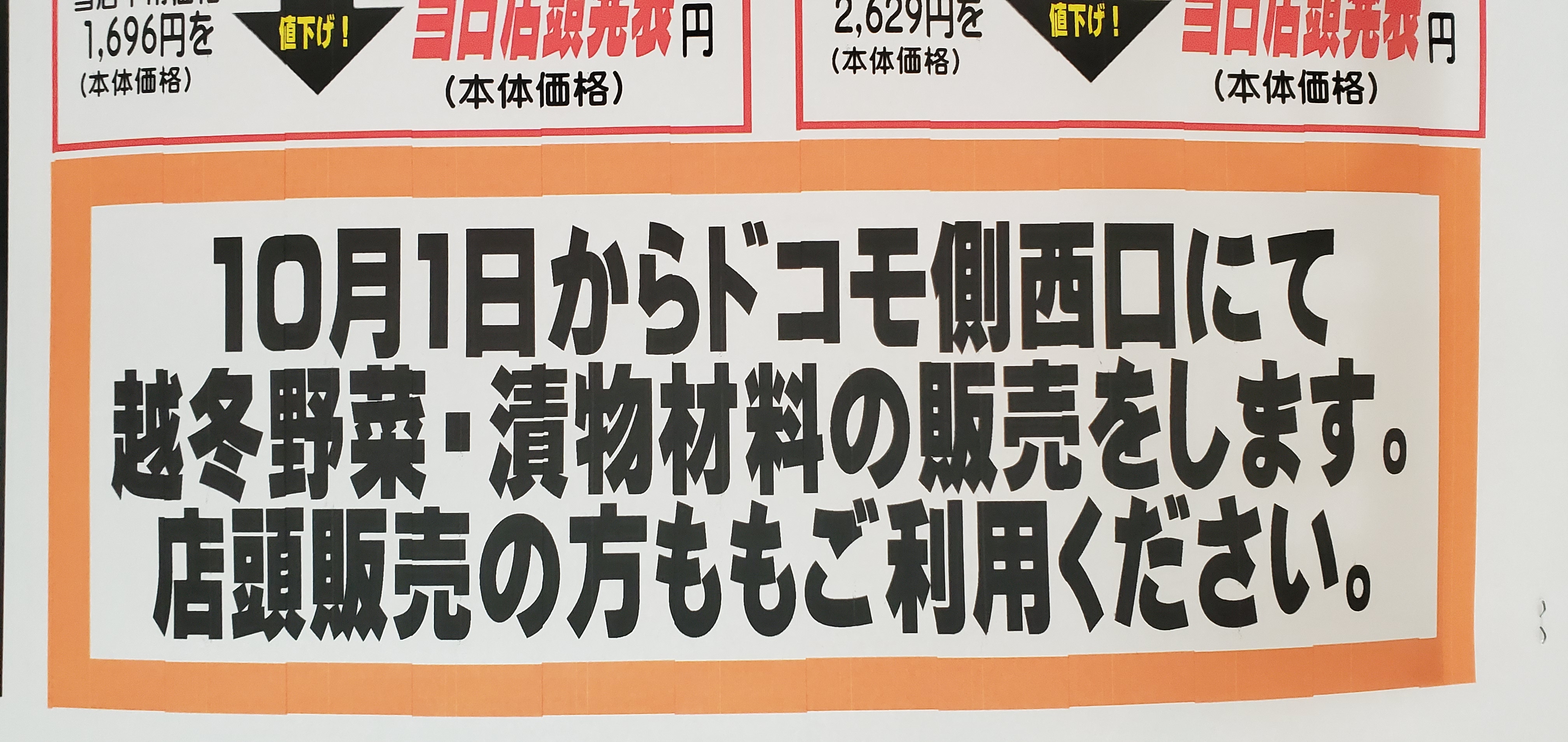 明日は10月1日の東武の一の市です。食品からキャノーラ油、おーいお茶など人気の商品を一の市価格で販売!また、明日から1ヶ月は外売りで漬物材料など販売いたします。ぜひ、ご来店されるときはドコモ側入り口からご利用お待ちしております。(^o^)/