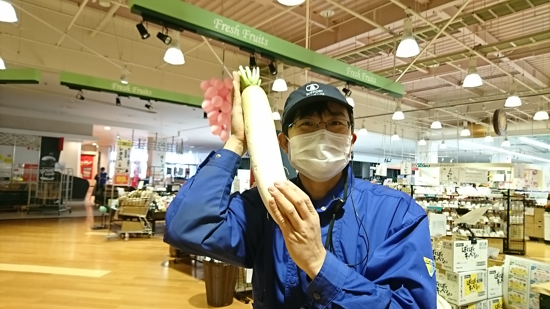 青果担当苫米地より、本日のオススメです。今回は青果コーナーの特別サポート商品のお知らせです。今回は大根が118円と大変お買い得になっていたす。この時期はおでんや汁物などのアツアツメニューには欠かせません。いつきてもお買い得な特別サポート商品をぜひご利用ください。
