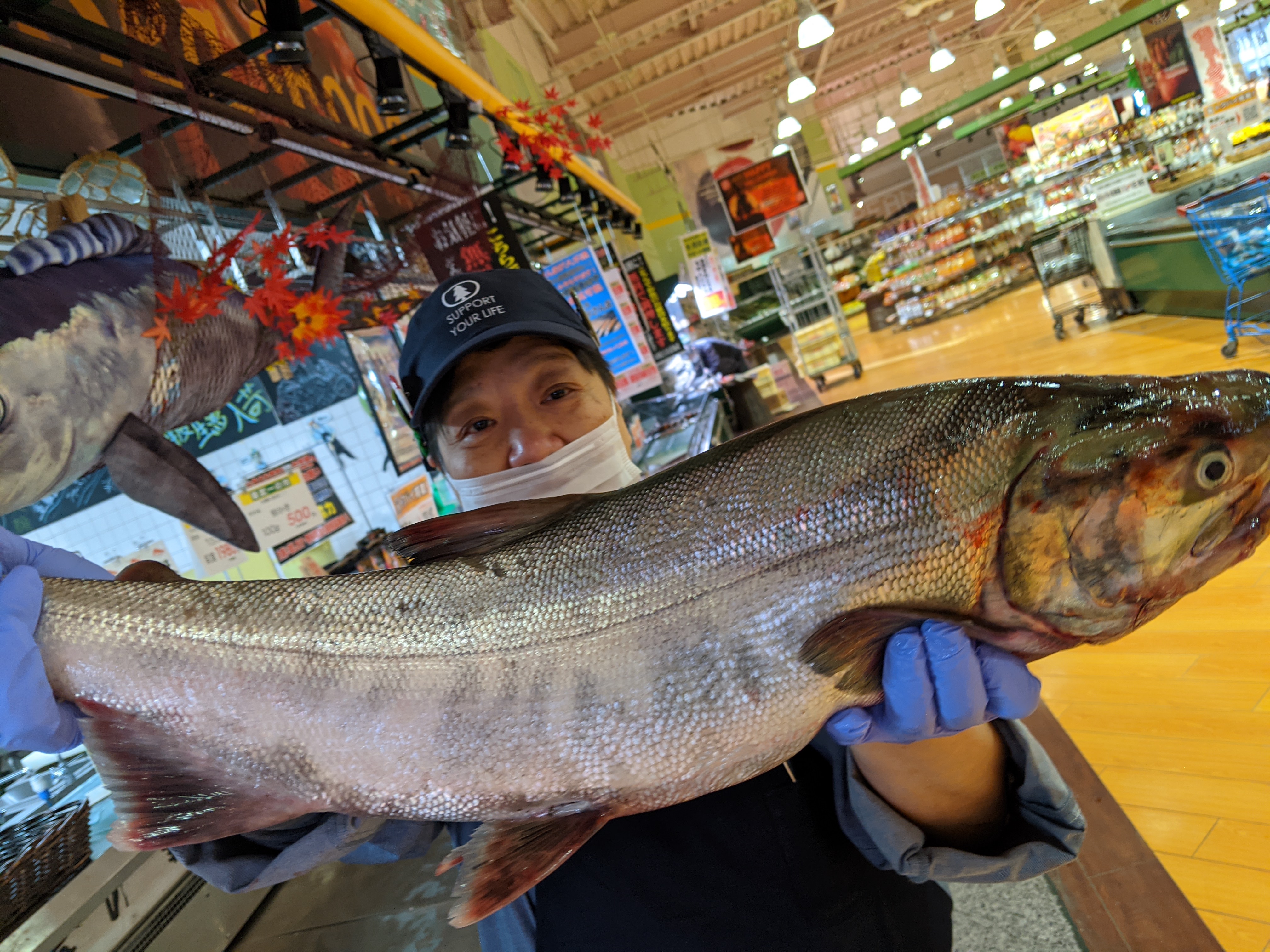本日は1の市!鮮魚コーナーでは生秋鮭が1950円とお買い得!立派な生秋鮭です、どうぞご利用くださいませ!