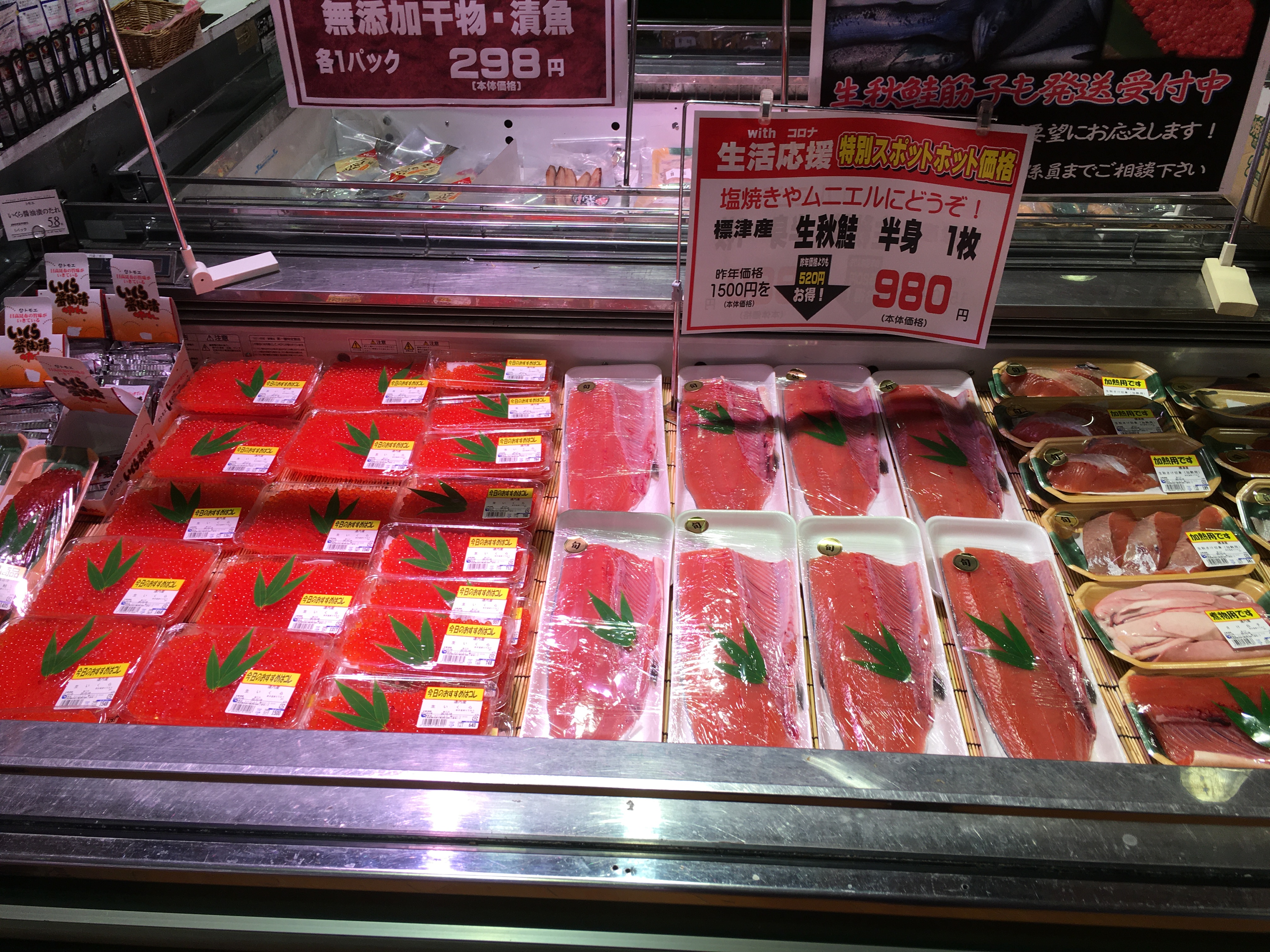 おはようございます。今日は、生秋鮭半身と生いくらバラ子がお買得です。旬の秋鮭でちゃんちゃん焼きとバラ子で飯寿司や鍋にどうぞ!