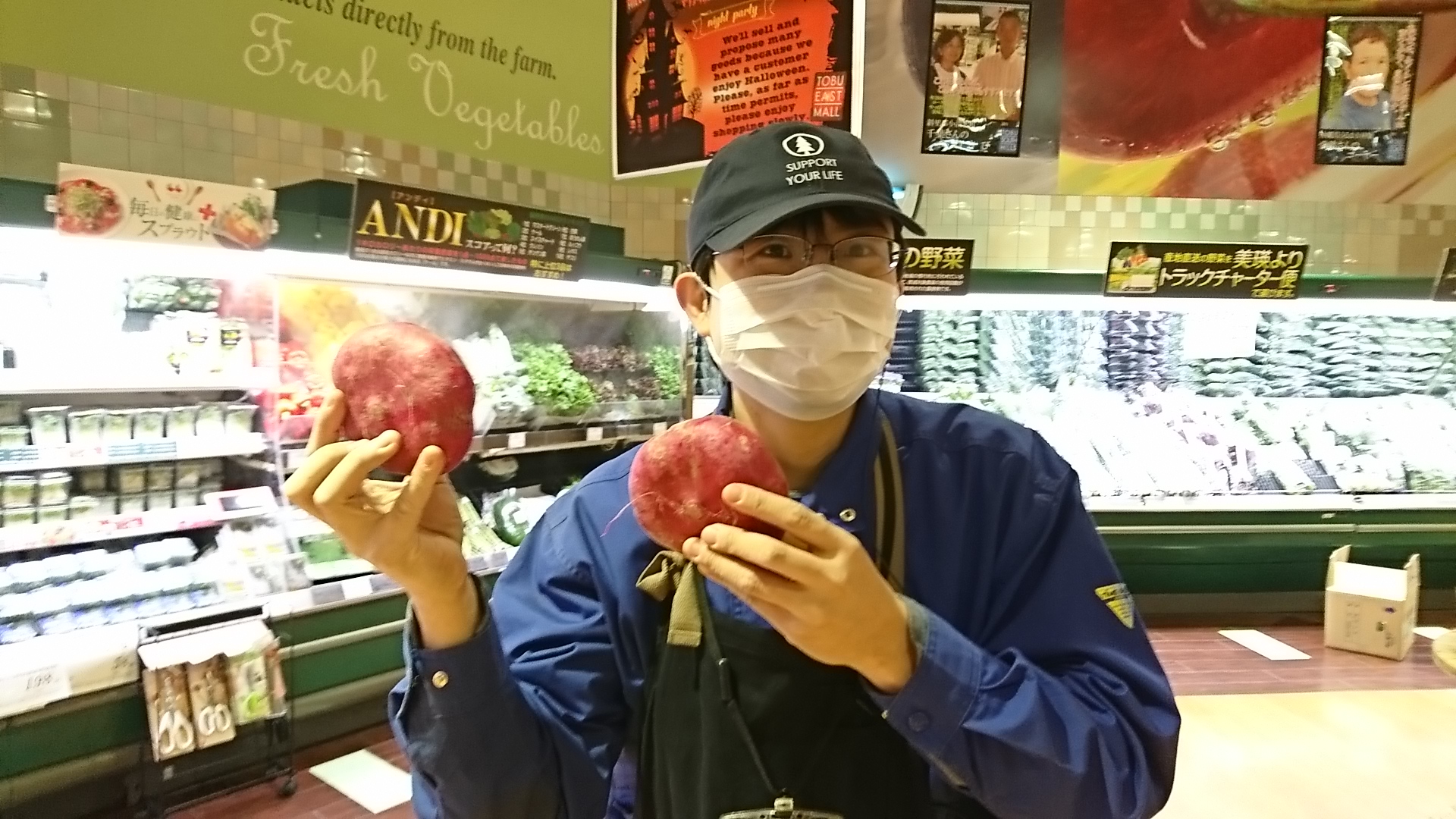 青果担当苫米地より、本日のオススメ商品です。今日ご紹介するのは知内産の赤かぶです。甘酢漬けはもちろん、和え物やサラダなどにもオススメ!ポタージュにするとピンク色の可愛いスープにもなります。この時期ならではのお野菜をぜひご利用ください。