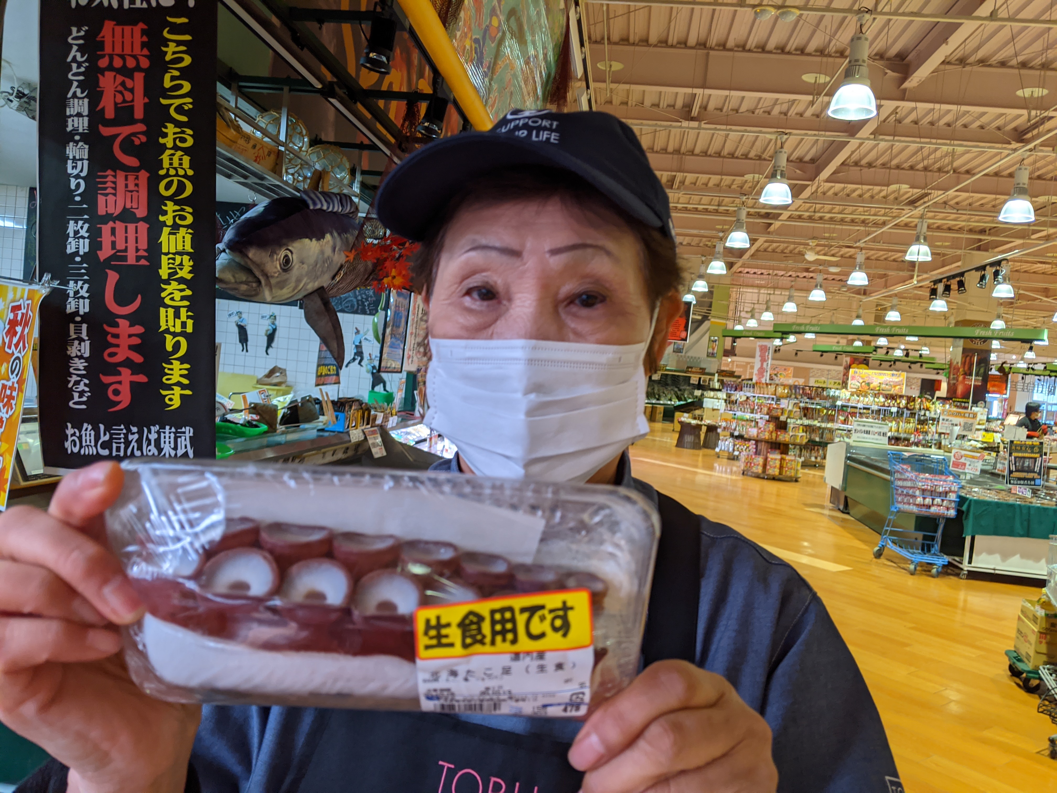 鮮魚コーナーでは美味しいタコ足を販売中です!たこ焼き、カルパッチョ等にいかがでしょうか!お買い求めしやすいハーフカットもありますので是非ご利用くださいませ