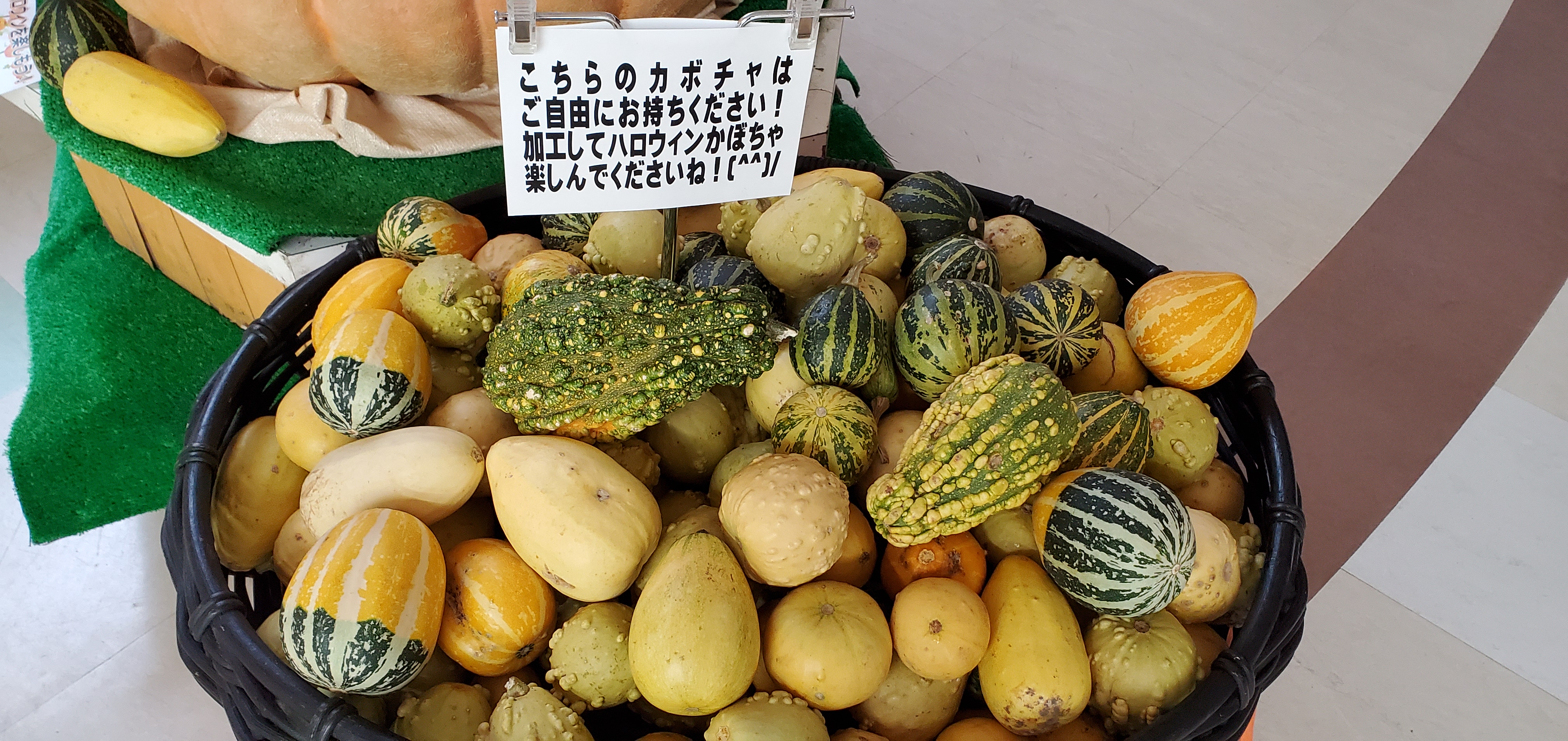 東武ではこちらのミニかぼちゃも無料にてプレゼントしております。また、大きなかぼちゃも差し上げています。年に一度のハロウィンを楽しみましょう!ぜひ、ご利用お待ちしております。(^o^)/