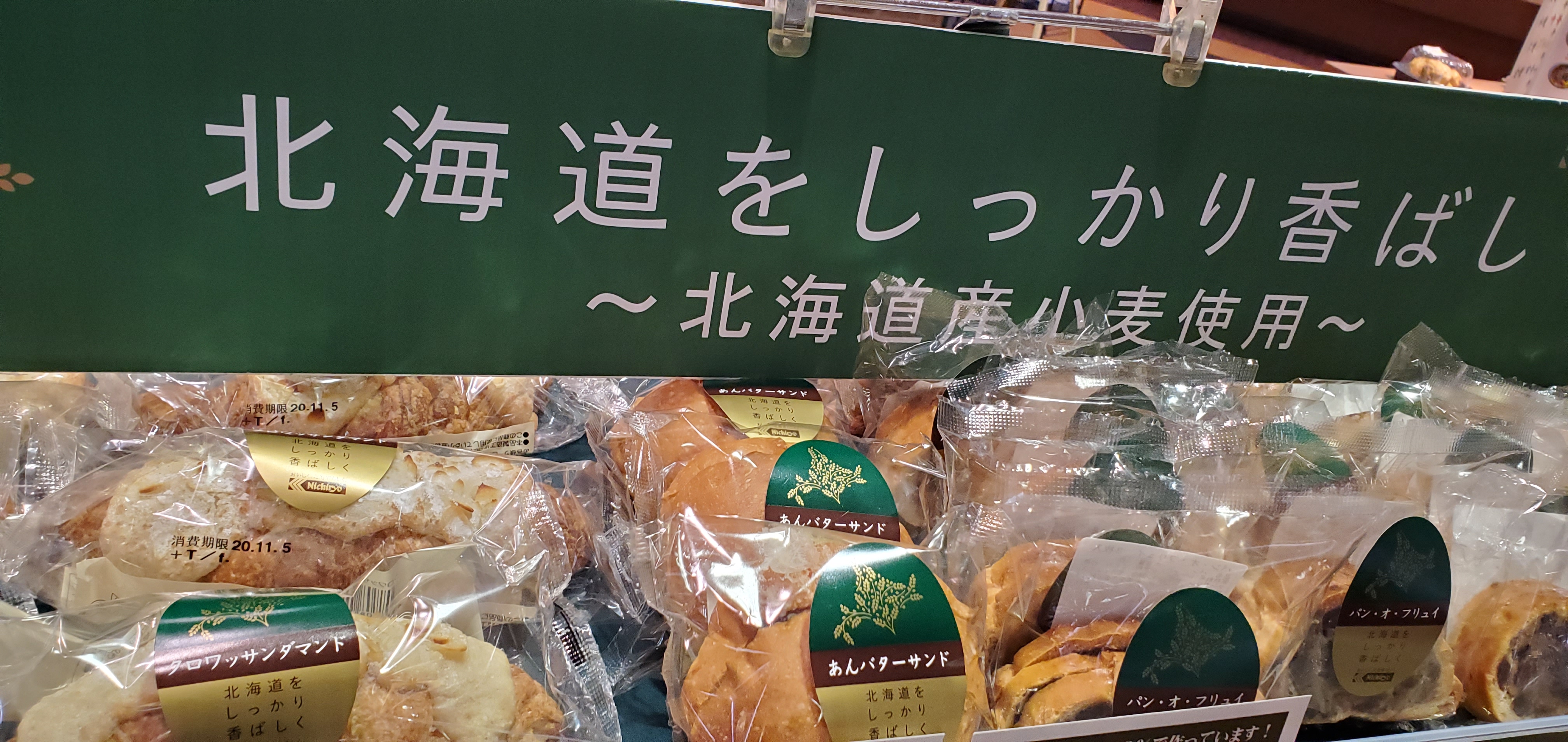 北海道小麦粉100%使用したパンを10種類以上用意して販売中!あなたのお好みパンがどれか選べるコーナーお惣菜前にて今月限定販売してますのでぜひ、ご利用お待ちしております。(^o^)/