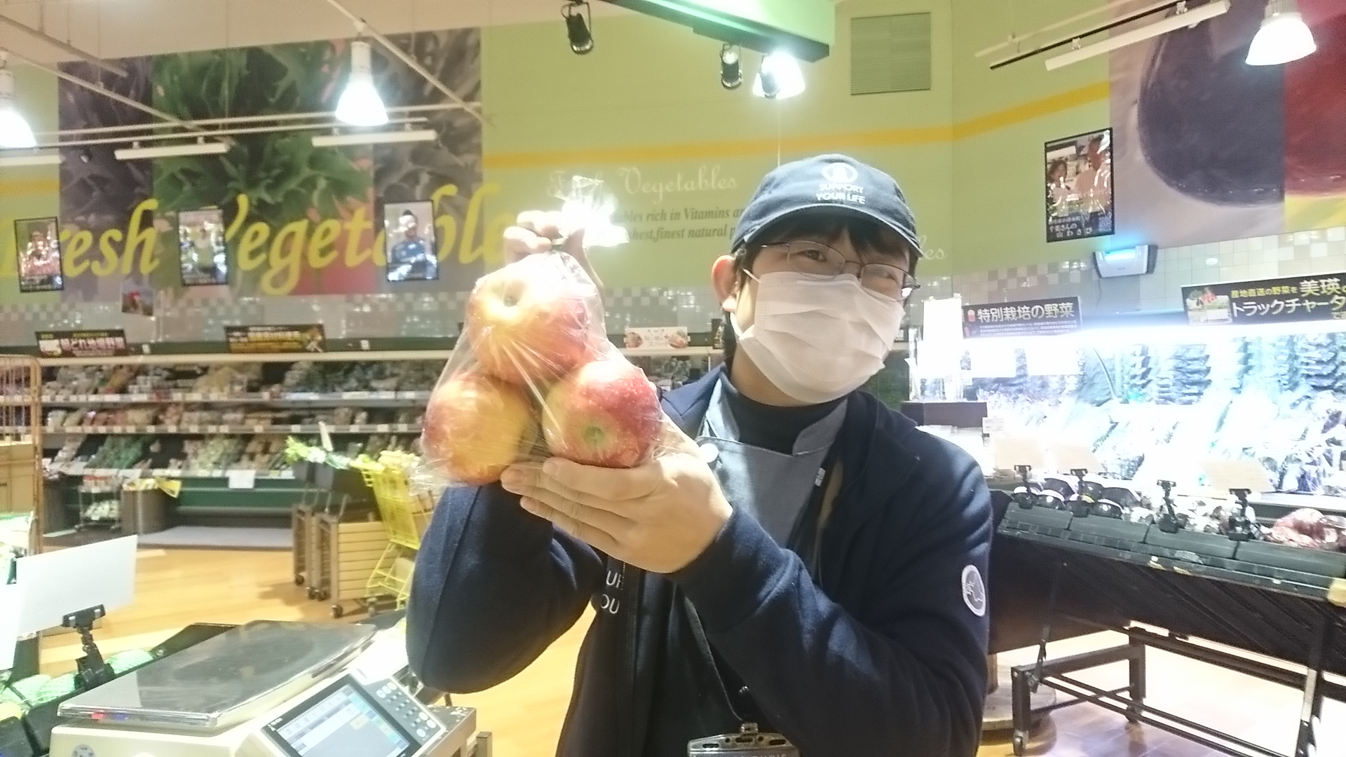 青果担当苫米地より、本日のオススメ商品です。今日ご紹介するのは岩手県産の千秋りんごです。パリッとした固めの歯ごたえで甘酸っぱいりんごです。お菓子作りにもオススメですので、ぜひご利用ください。