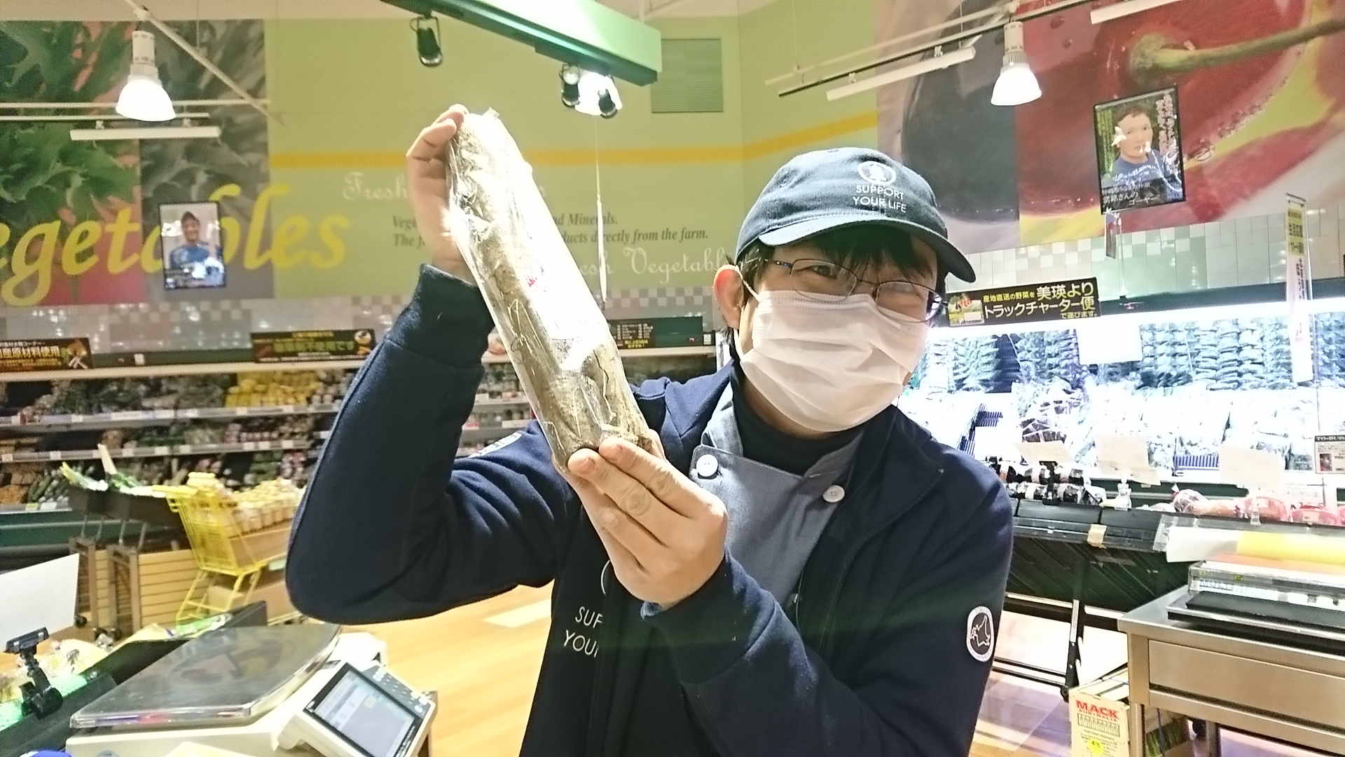 青果担当苫米地より、本日のオススメ商品です。今日ご紹介するのは北海道産の和田さんのやわらか太ごぼうです。極太ですが柔らかな肉質のごぼうで、通常のごぼうの2、3倍の糖度を誇る美味しいごぼうです。煮物やきんぴら、かき揚げにいかがでしょうか?ぜひご利用ください。
