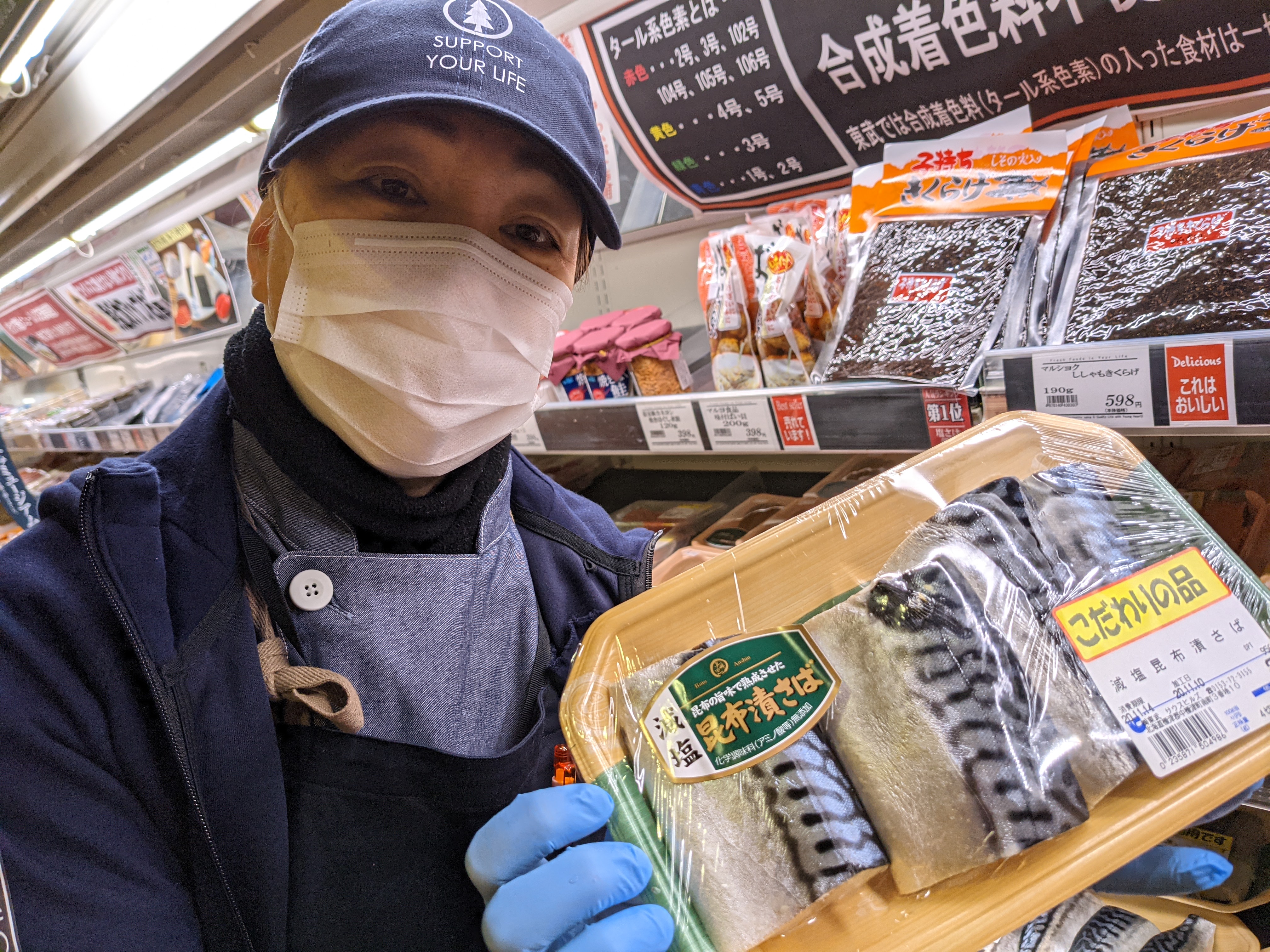 鮮魚コーナーでは減塩の美味しい塩サバを販売中!減塩ですが脂がのっていて美味しいんです!是非お試しくださいませ、当店の人気商品です!