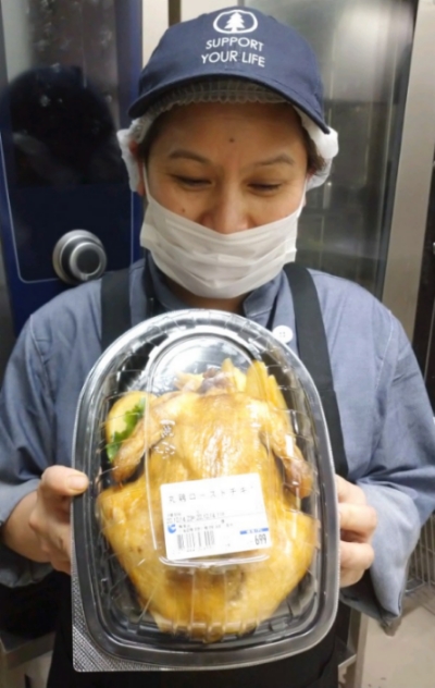 おはようございます。クリスマスが近づいてまいりました。お惣菜コーナーでは丸鶏のローストチキンを販売中。店内で漬け込みじっくりと焼いた美味しさ満点の商品となっております。クリスマスまでの限定商品となっておりますので是非ご利用ください。
