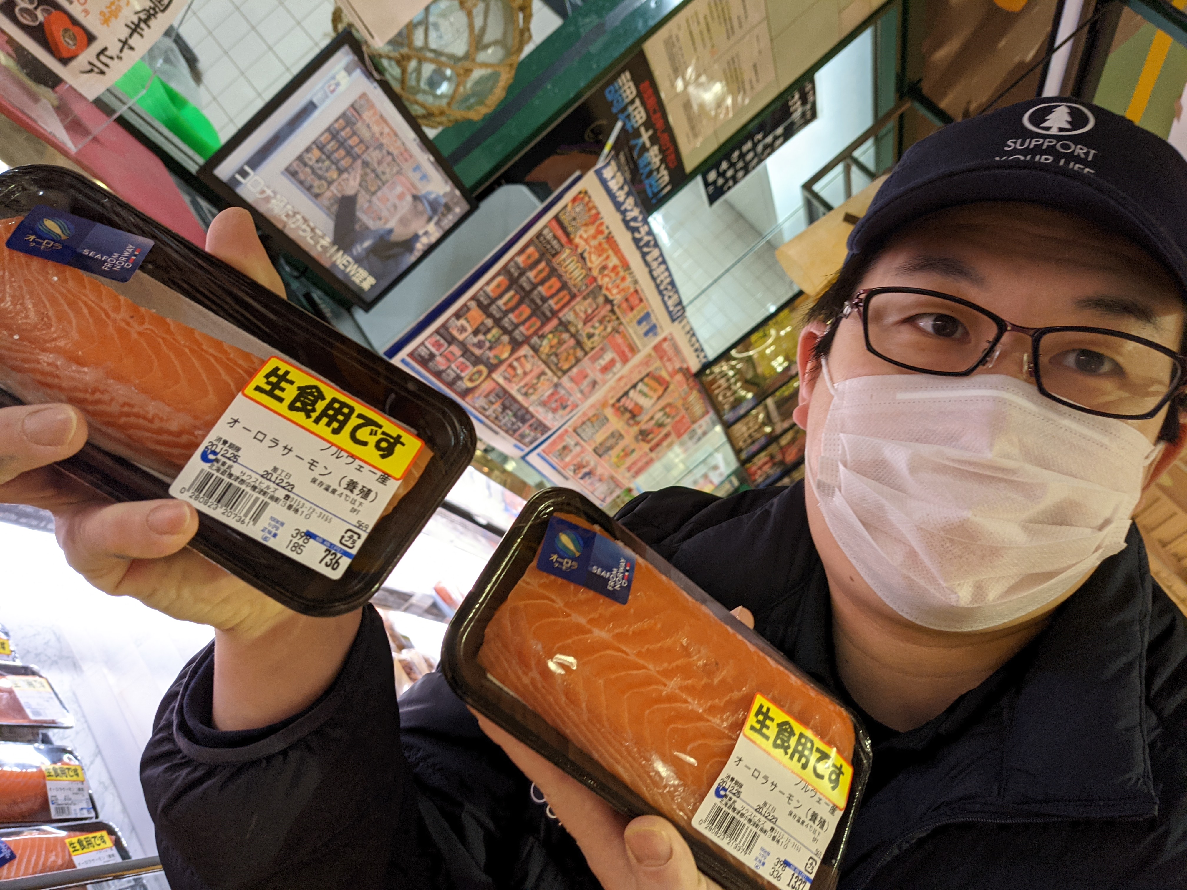 本日はクリスマスイヴイヴですね!当店の美味しいオーロラサーモンをご利用くださいませ!脂がのって最高ですよ、是非どうぞ!