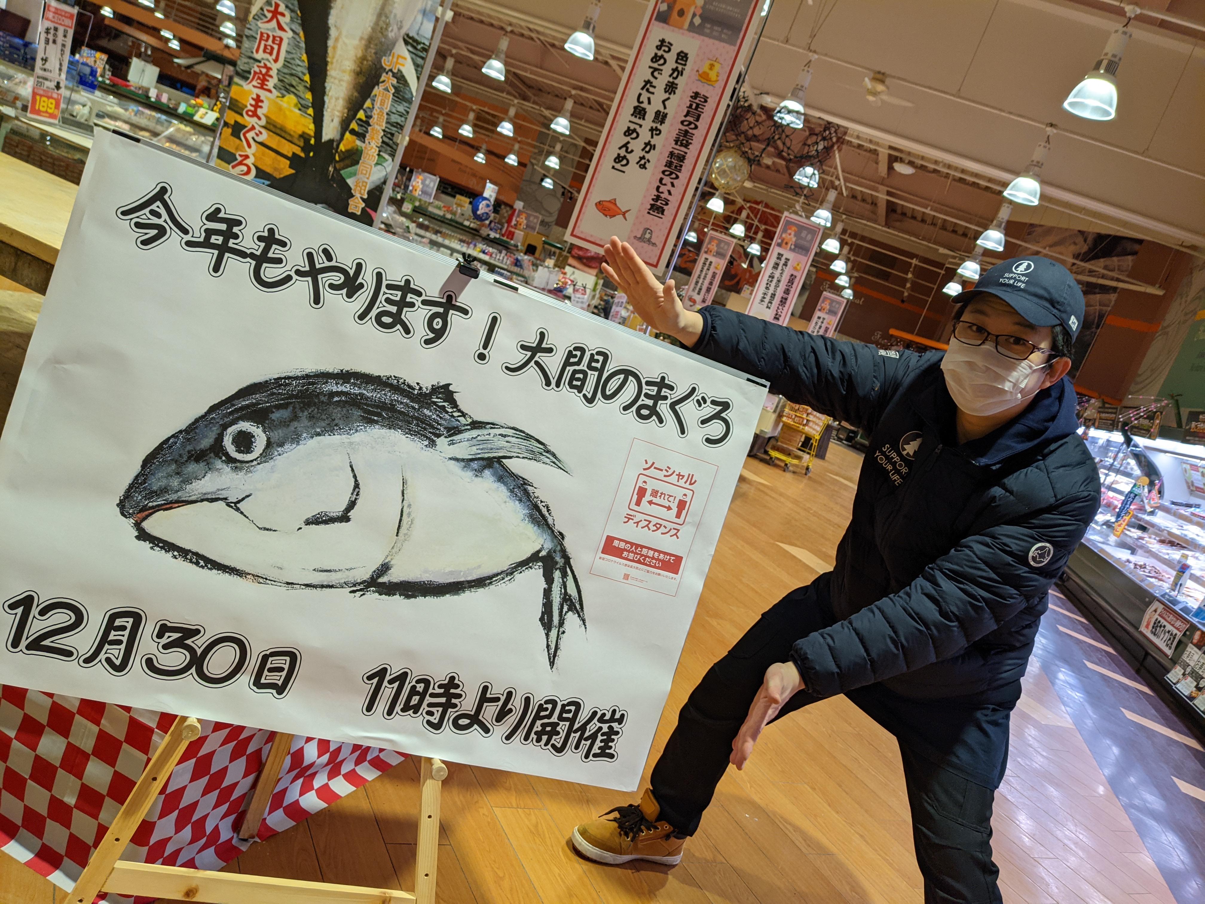 鮮魚コーナーでは本日大間のマグロの解体を致します!大きなものを食べると縁起が良いですよ!是非当店の大間のマグロをご利用くださいませ!