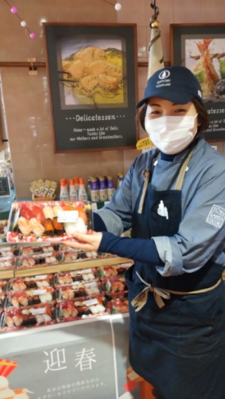 おはようございます。惣菜コーナーでは生寿司 宴を販売中。こちら年末年始の限定商品となります。このご時世、シェアして食べるのが不安ということもあるでしょう。1人前を人数分、なんていうのもいかがでしょうか。美味しいお寿司、是非ご利用ください。