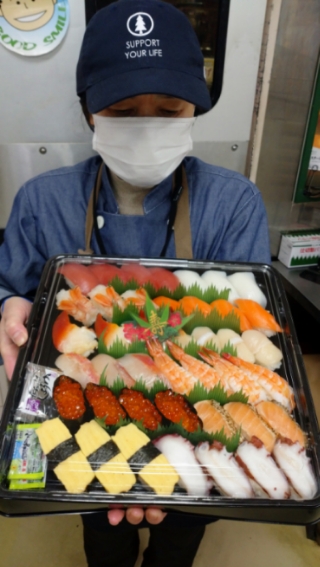 おはようございます。お惣菜コーナーでは生寿司恵比寿を販売中。いくらやえびなど多種類入れたお得なお寿司となっております。お正月に皆さんでいかがでしょうか?ぜひご利用ください。