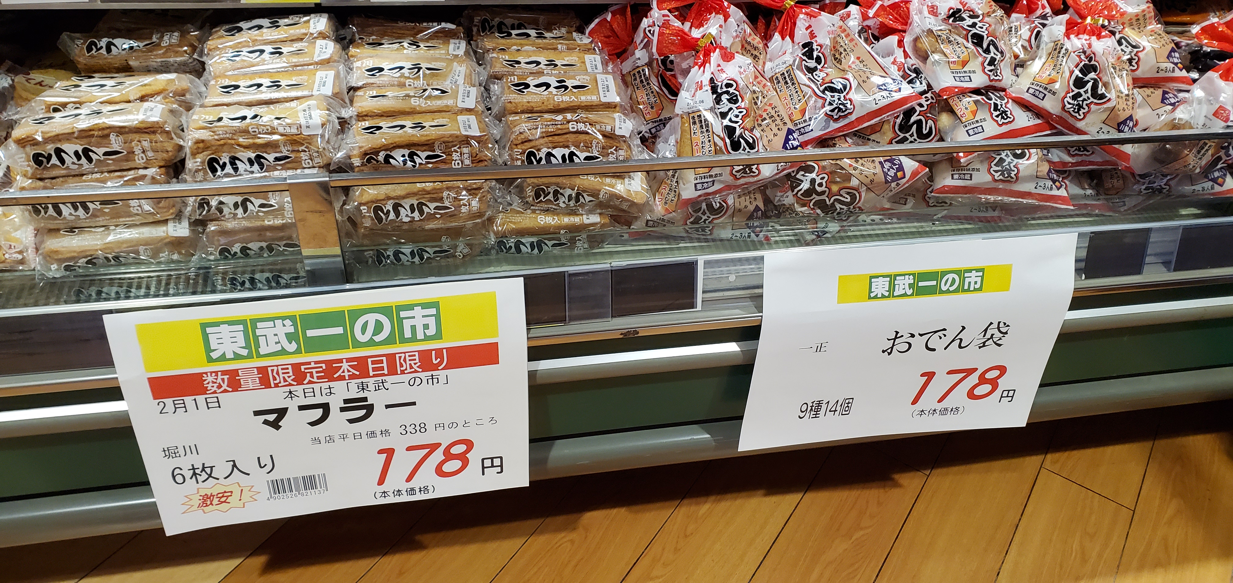 今日は一の市です。人気のカツゲンや雪印コーヒー、ブルガリアヨーグルト、こちらのおでんセットやマフラー、チーズなどなどお買い得満載!明日は節分なのでお得な本日はぜひ、ご利用お待ちしております。(^o^)/