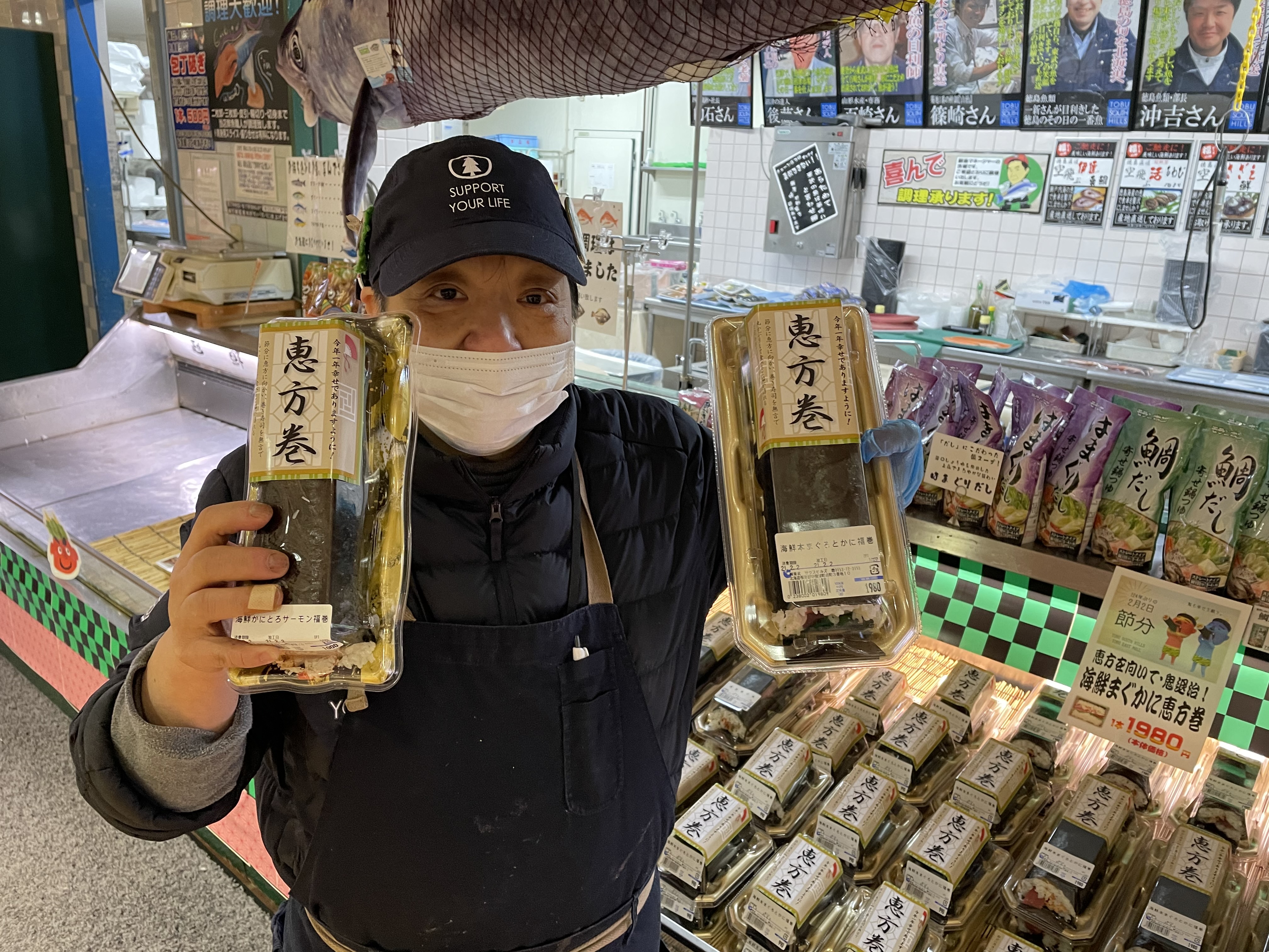おはようございます。今日は、節分です。2月2日に節分になるのはなんと124年ぶりの事なんです。めっちゃびっくりですよね!お魚屋さんのでは、かにたっぷり煉獄恵方巻やまぐろとかにが入ったまぐかま恵方巻など全12種類ご用意しております。ハーフサイズもあります。また、いわしの塩焼き、いわしフライ、いわしのコールスローとご用意していますのでぜひ、ご利用下さい。