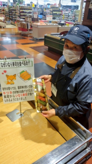 おはようございます。本日は初午。お惣菜コーナーではいなり寿司バイキング開催中。いなり寿司からオールスター、鶏そぼろやえびアボカドいなりなど。各種多数取り揃えております。是非ご利用ください。