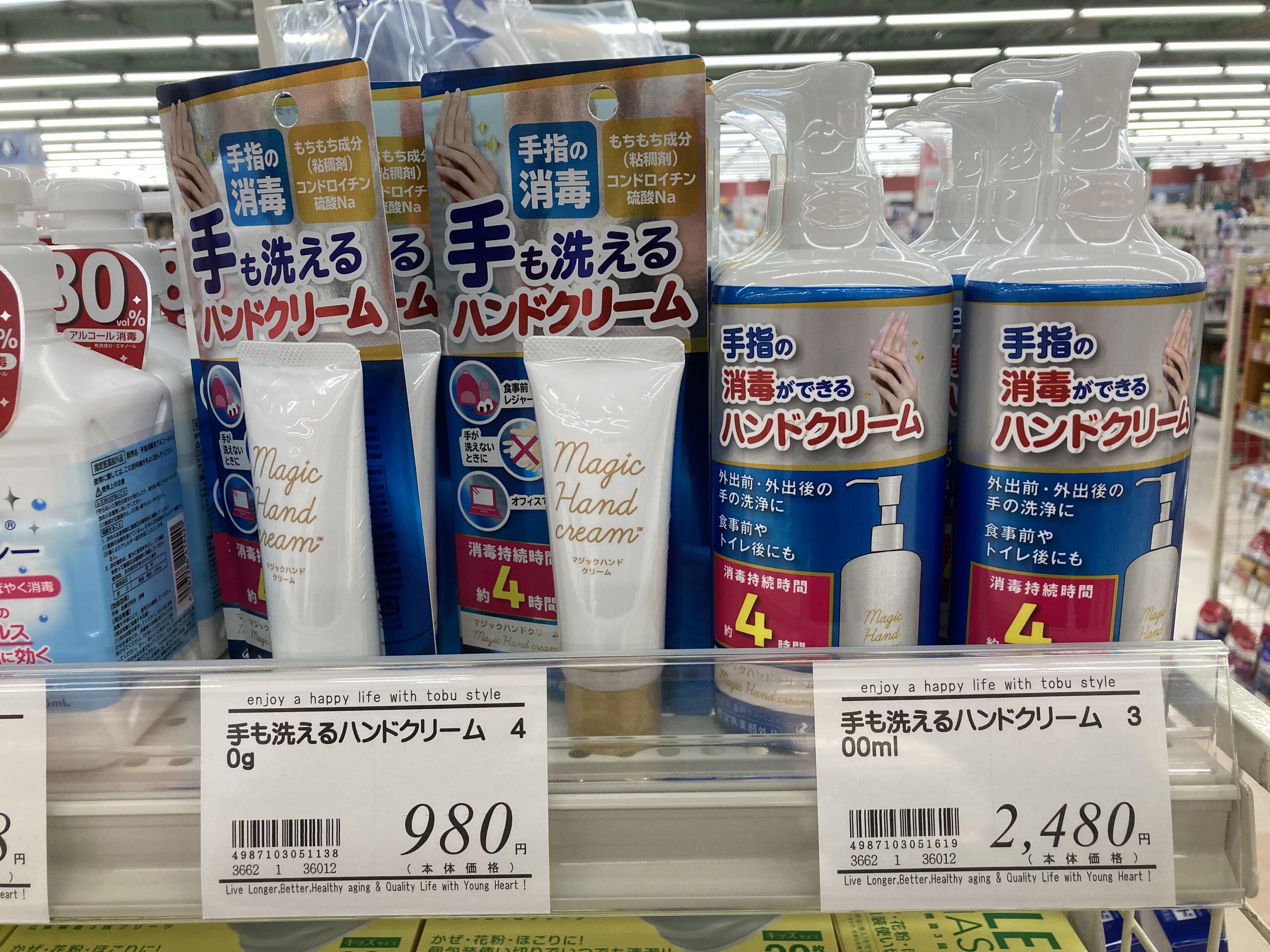 みなさんこんにちは!今日ご紹介の商品はゼリア新薬さんの「手も洗えるハンドクリーム」です!こちらの商品は、いつでもどこでも水なしで手を清潔にできる手指洗浄・消毒用ハンドクリームです!消毒効果は約4時間!そして、コンドロイチン、ヒアルロン酸などの保湿作用のある成分を配合しているので、しっとりとした使用感なのもうれしいですね!気になる方は是非お試しください!