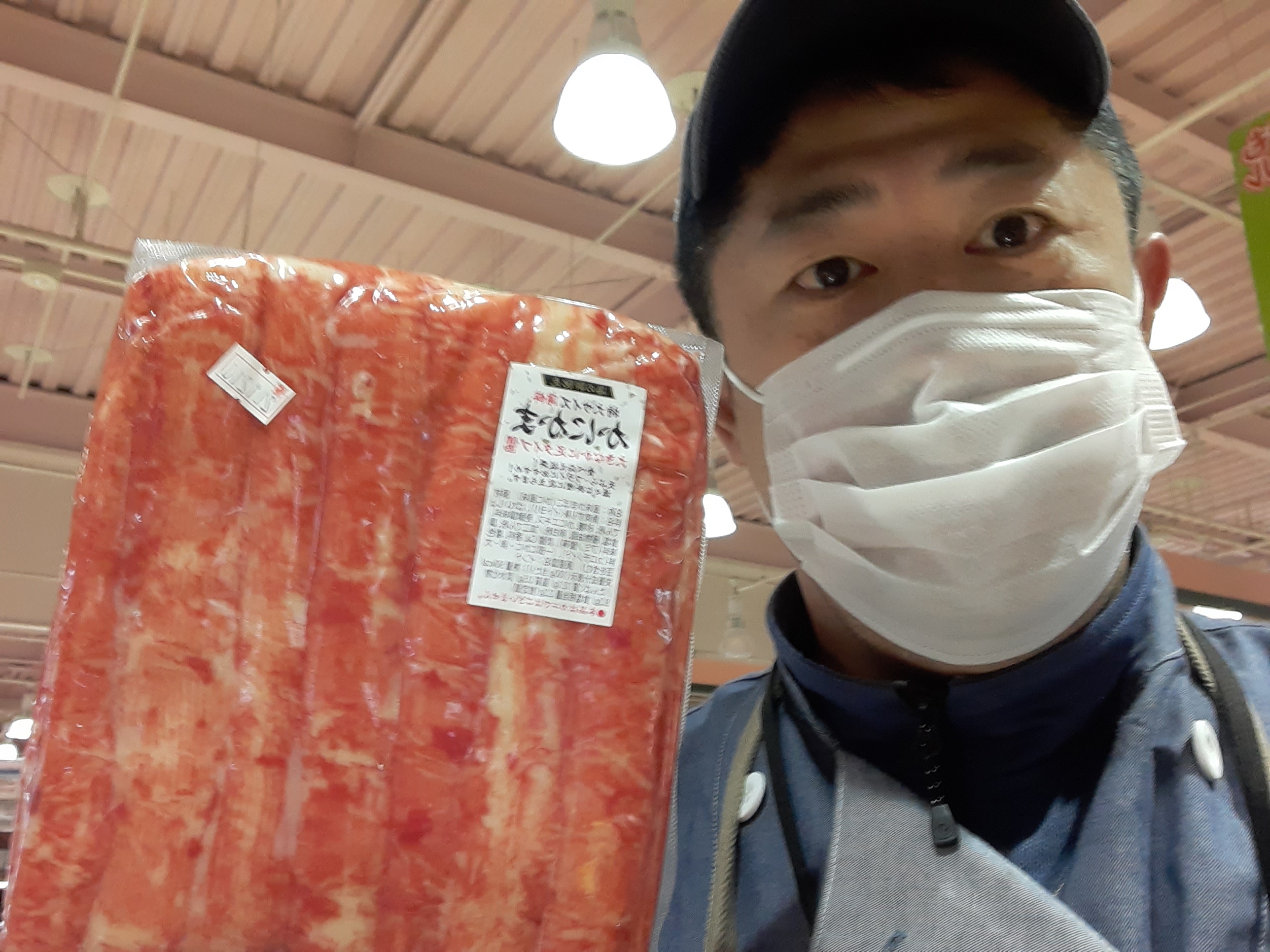 おはようございます。本日は売り切り価格!!かに風味かまぼこ1袋が約1キロ入って798円!!早い者勝ち!是非お試し下さい。本日も鮮魚コーナーでお待ちしております。