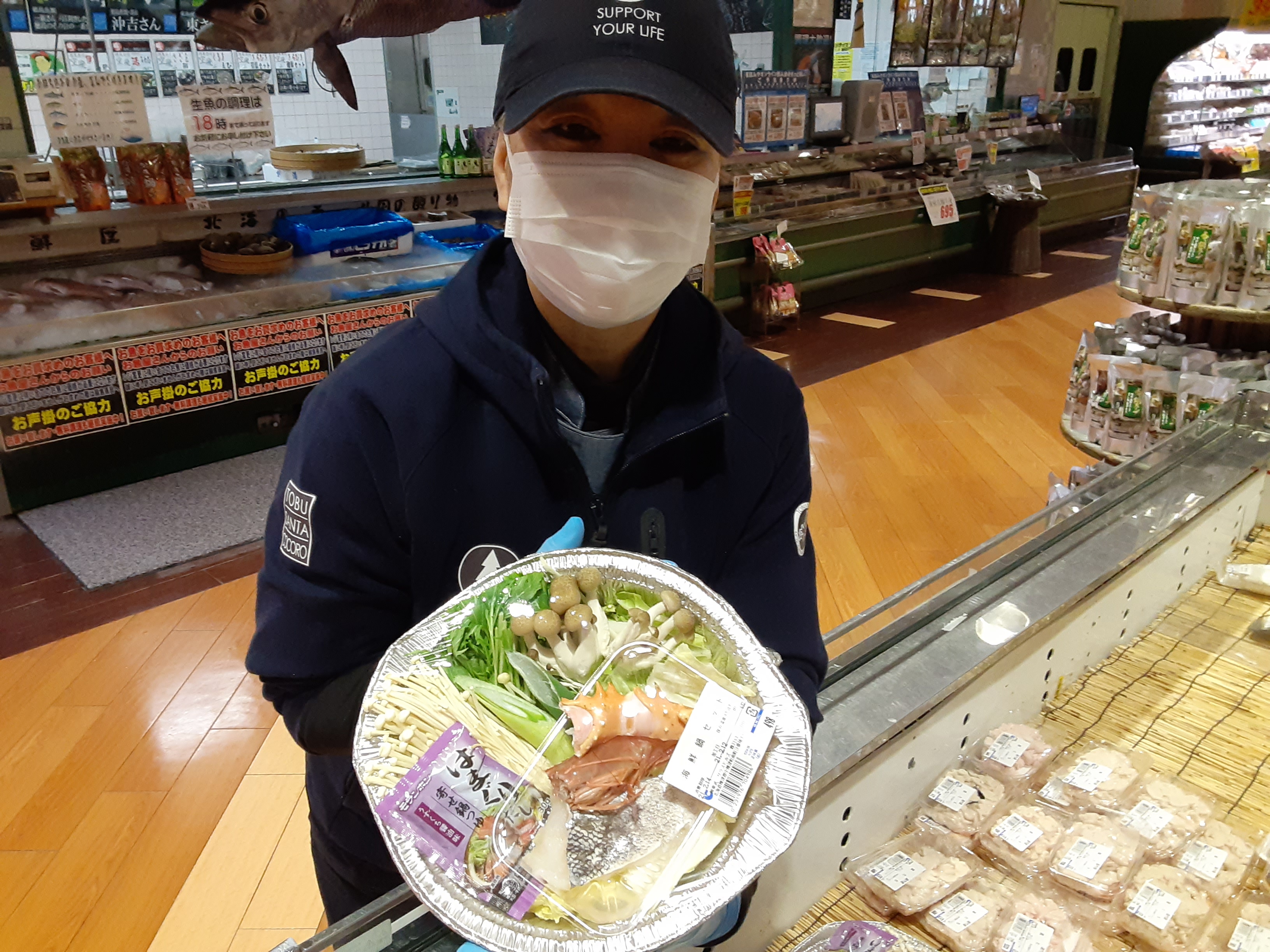 おはようございます。本日は寒いからこそ食べたくなる!海鮮鍋!!1人前 498円ちょっと食べたくなる鍋!!その後の雑炊がたまらない!!是非お試し下さい。本日も鮮魚コーナーでお待ちしております。