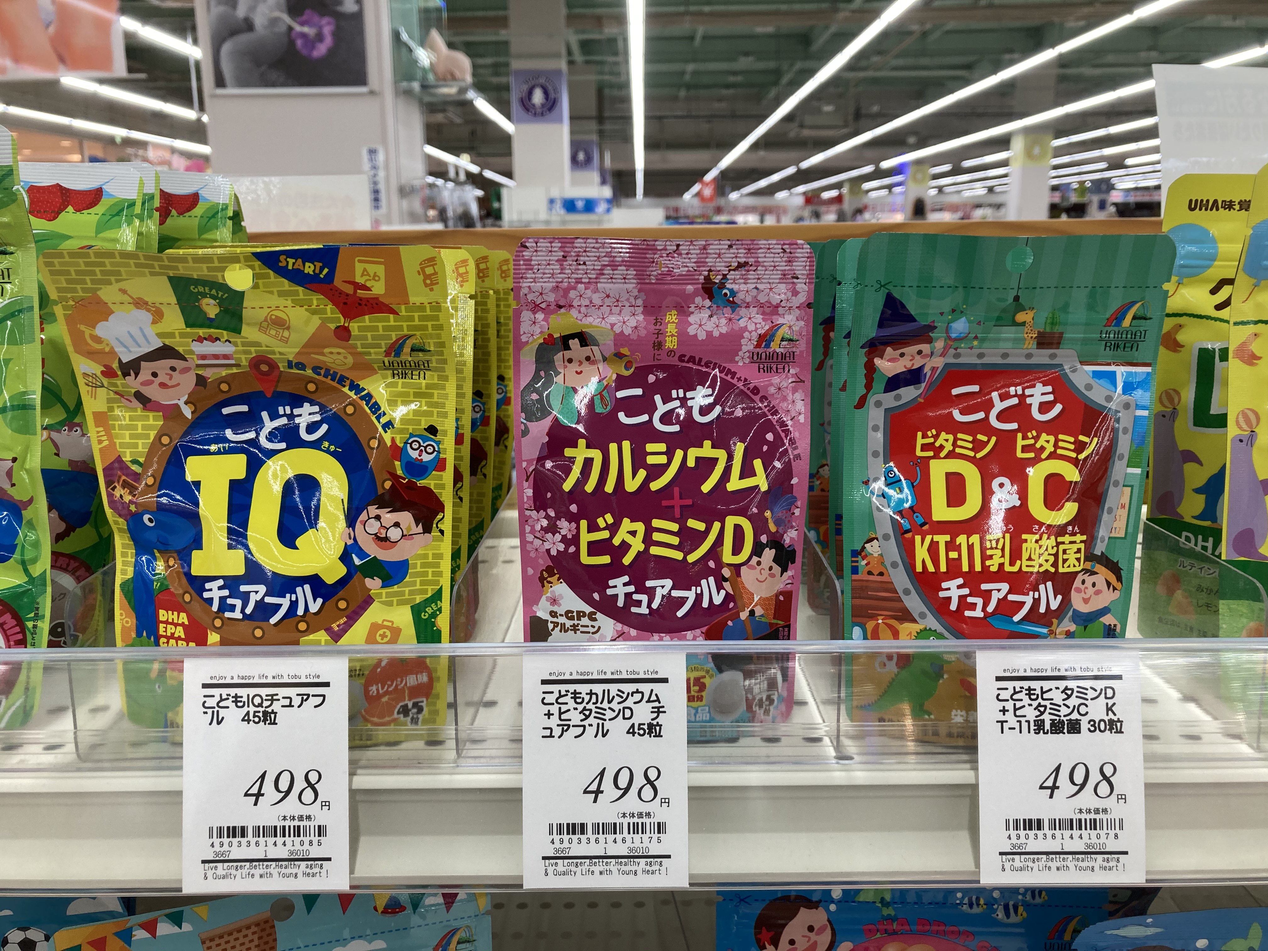 1日2粒で、ビタミンD5.5㎍、ビタミンC100㎎、KT-11乳酸菌2億個が摂取できる「こどもビタミンD&ビタミンC KT-11乳酸菌 チュアブル」、1日3粒で、不足しがちなカルシウムを牛乳1本分(200ml)の227㎎、ビタミンD 5㎍、CCP114㎎、さらにα-GPC3㎎、アルギニン10㎎ といった充実の成長サポート成分もお菓子感覚で摂取できる「こどもカルシウム+ビタミンD チュアブル」、3粒で、DHA50㎎、さらに、EPA10㎎、GABA(ギャバ)10㎎が摂取でき、お子様の学ぶ力やリラックスをサポートできる「こどもIQチュアブル」の3種類です!気になる方は是非お試しくださいね!