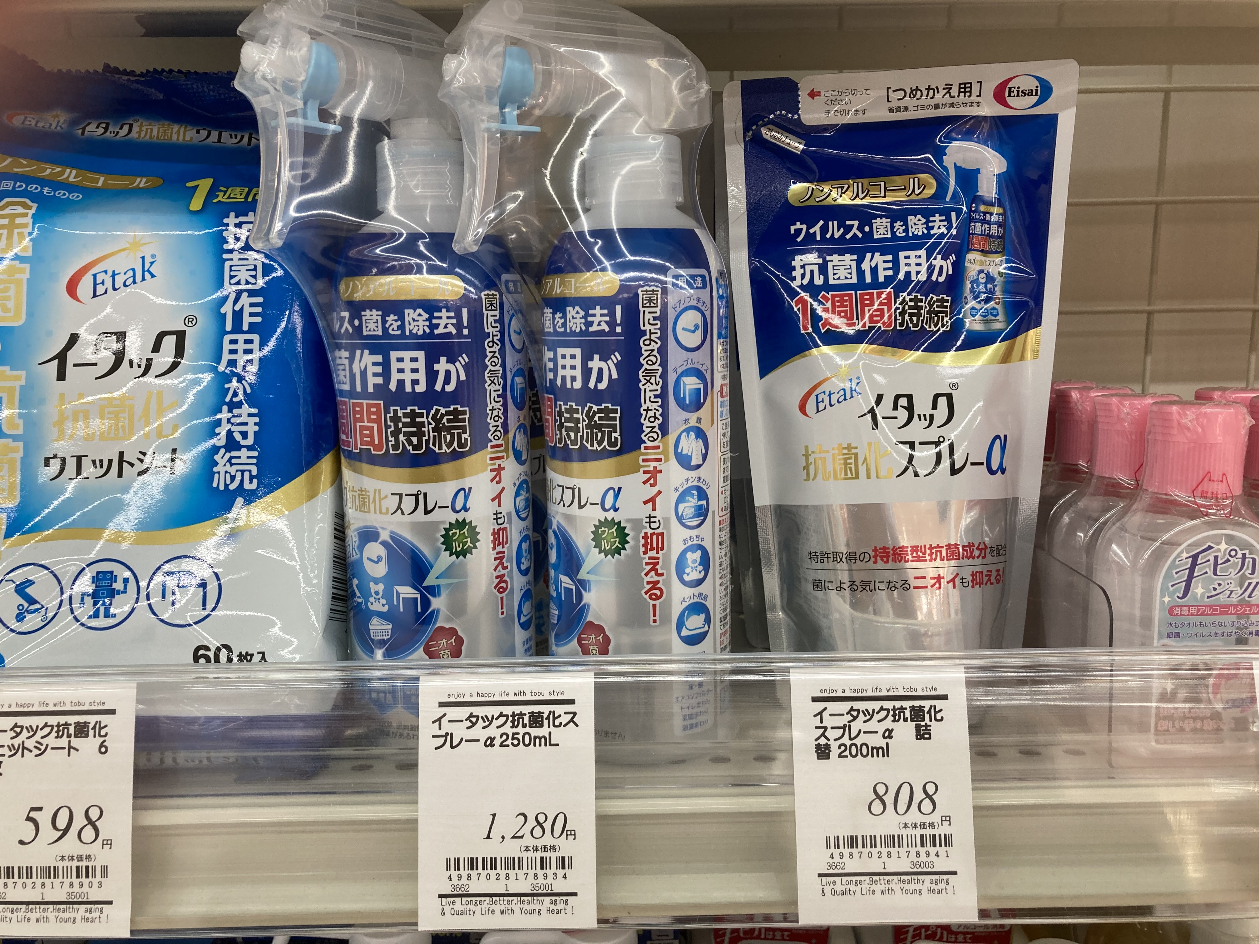 みなさんこんにちは!今日ご紹介の商品はエーザイさんの「イータック」です!こちらの商品は、ウイルス・菌を寄せ付けない!持続型抗菌成分Etak®の作用で抗菌バリアが1週間持続し、ウイルス・菌から大切なモノを守ります!スプレータイプやウェットシートタイプがありますので、ウイルス、菌が気になるところに合わせてお使いくださいね!気になる方は是非お試しくださいね!